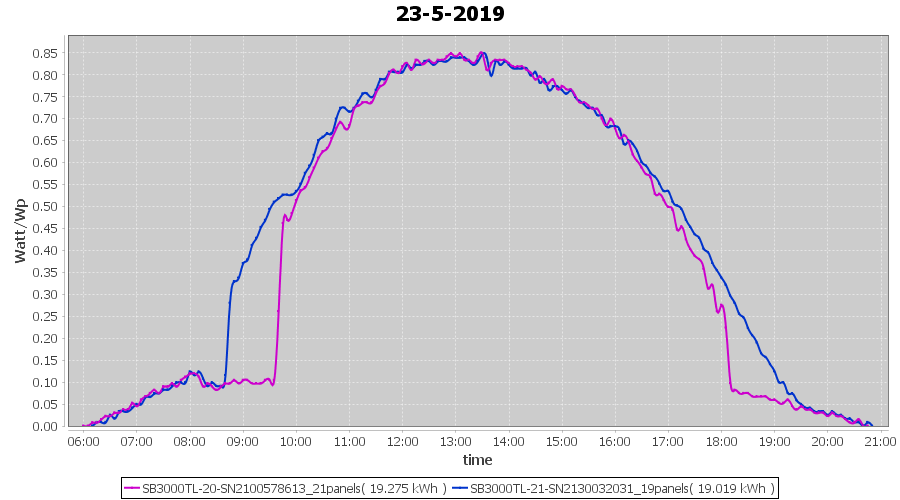 | 23-5-2019 | kWh | Sum | W/Wp | 38.294 | 6000 | 6.4 | 17.711 | € 13.74 | 4.9 |
