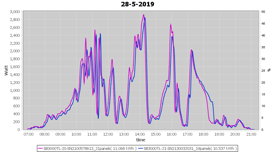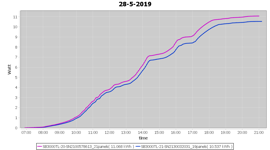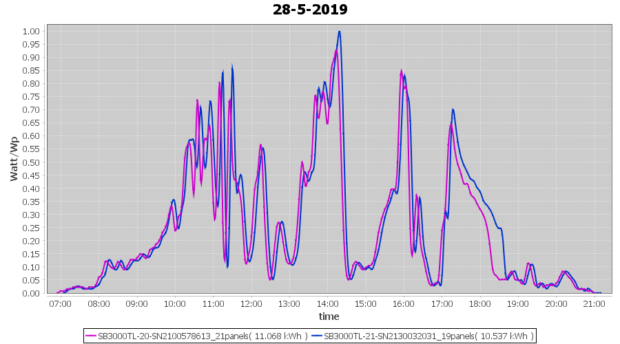 | 28-5-2019 | kWh | Sum | W/Wp | 21.605 | 6000 | 3.6 | 9.992 | € 7.75 | 2.8 |