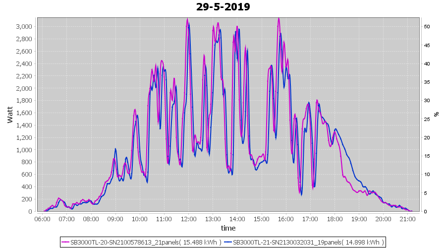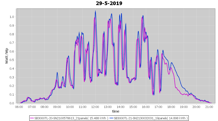 | 29-5-2019 | kWh | Sum | W/Wp | 30.386 | 6000 | 5.1 | 14.054 | € 10.90 | 3.9 |