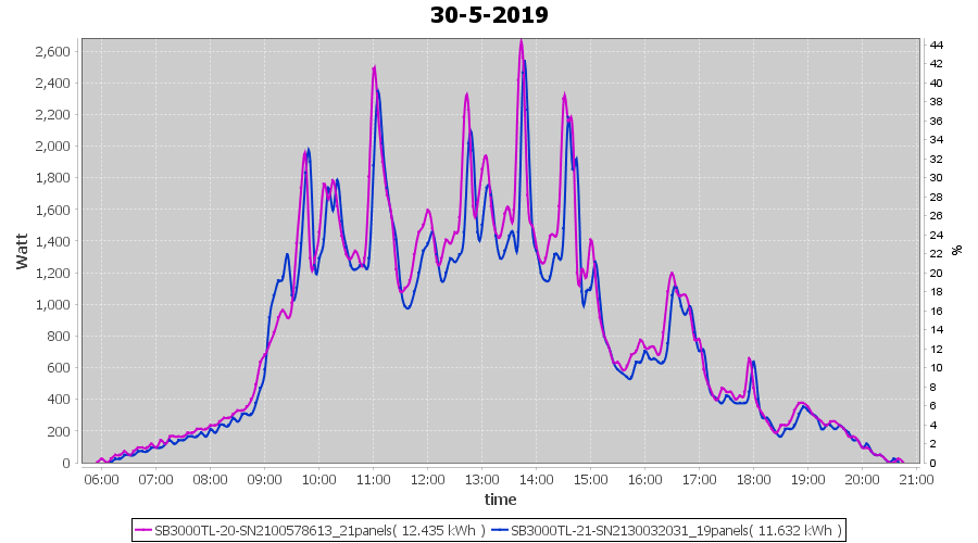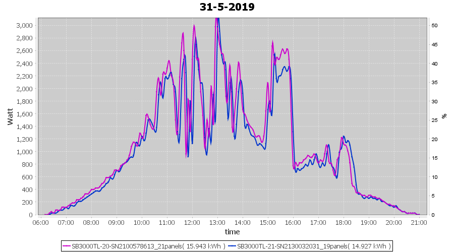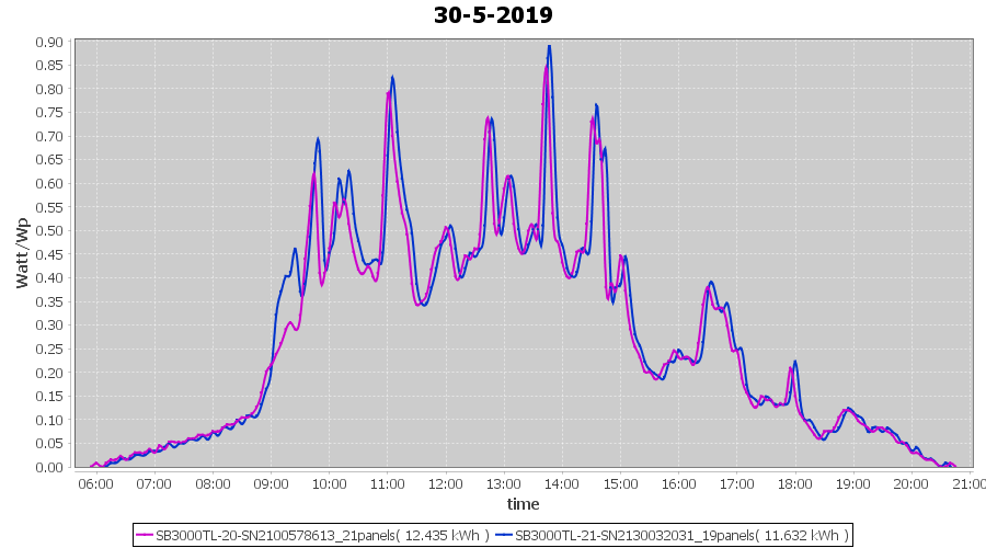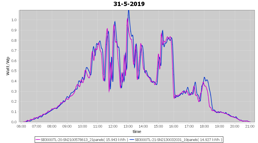 | 30-5-2019 | kWh | Sum | W/Wp | 24.067 | 6000 | 4.0 | 11.131 | € 8.64 | 3.1 |