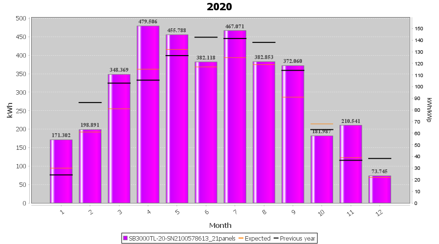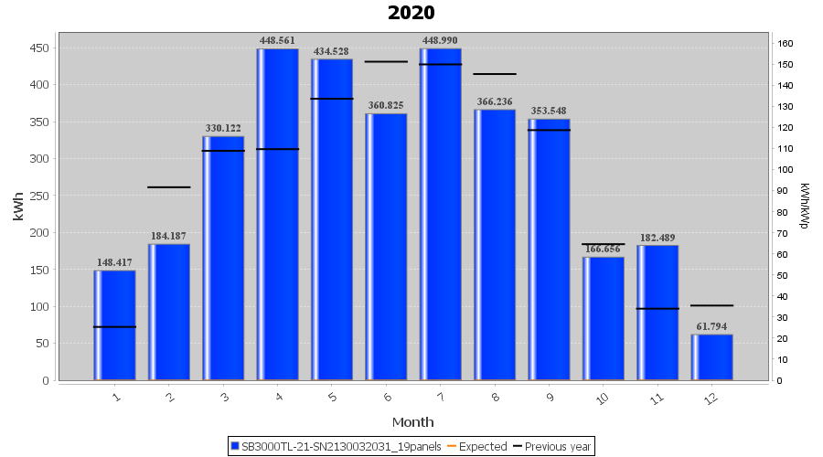 | Month | Yield (kWh) | Wp | kWh/kWp | Co2 (Kg) | Savings | % |