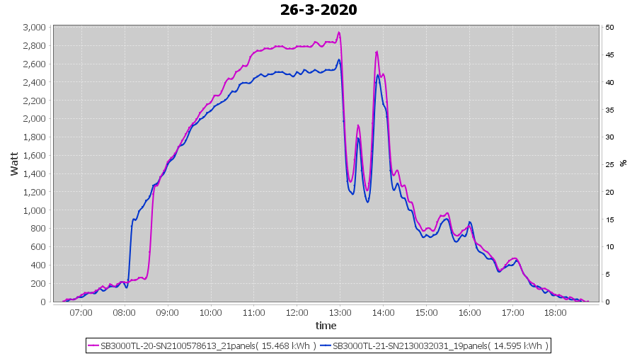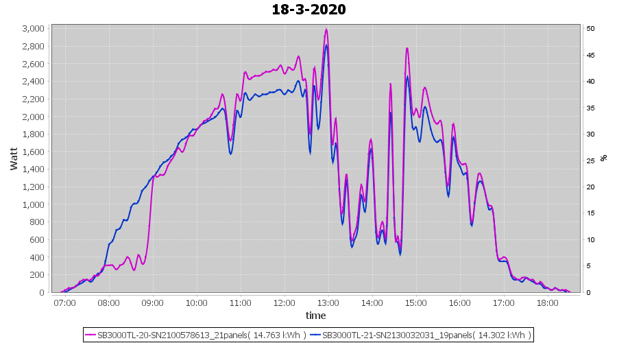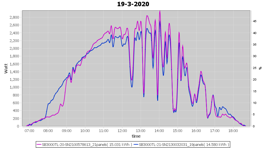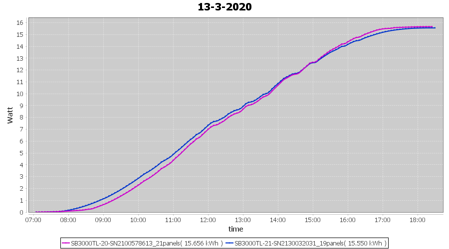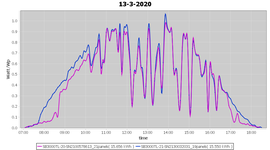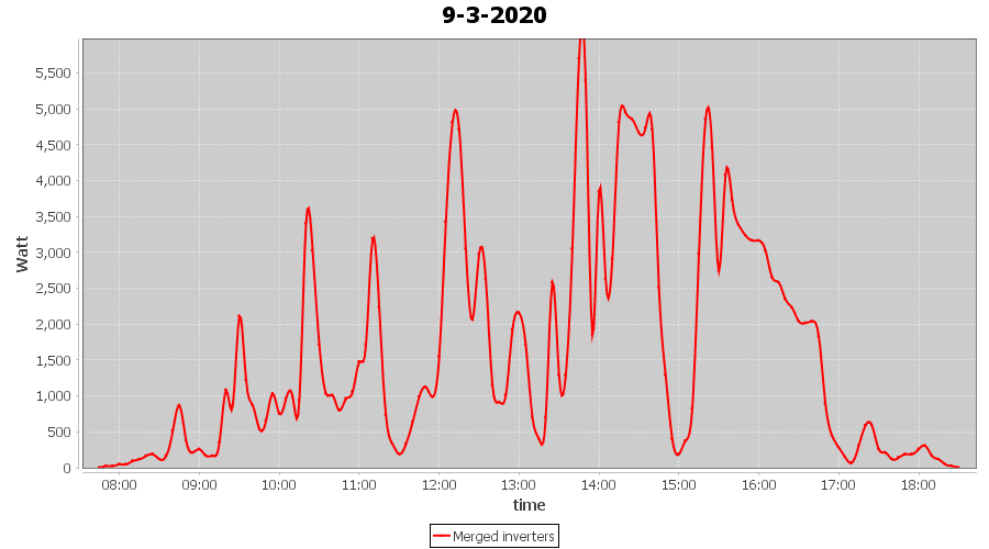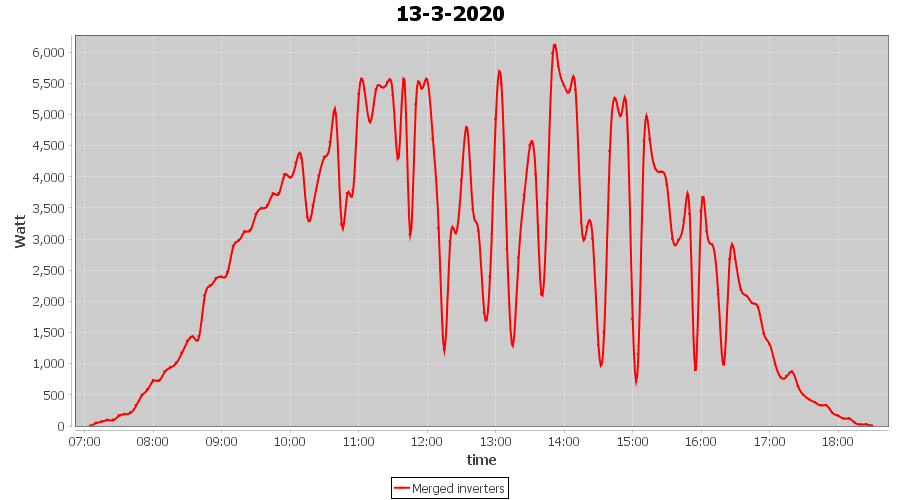 | 13-3-2020 | kWh | Sum | W/Wp | 31.206 | 6000 | 5.2 | 14.433 | € 11.23 | 4.6 |