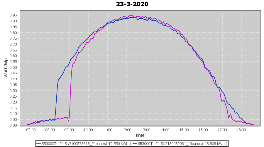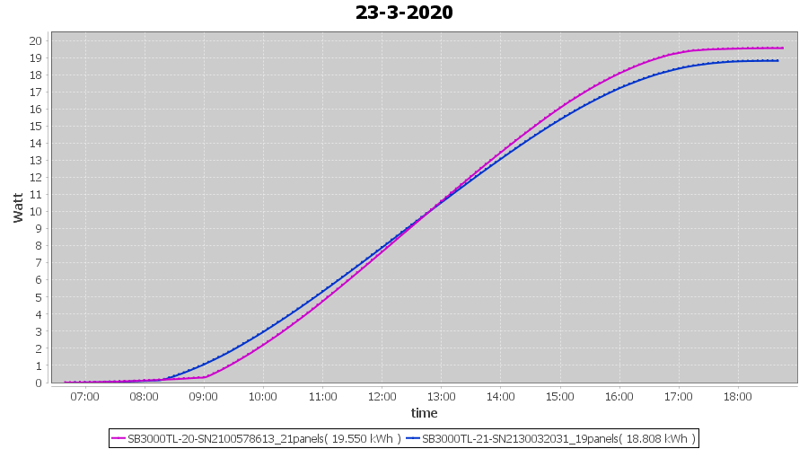 | 23-3-2020 | kWh | Sum | W/Wp | 38.358 | 6000 | 6.4 | 17.741 | € 13.81 | 5.7 |