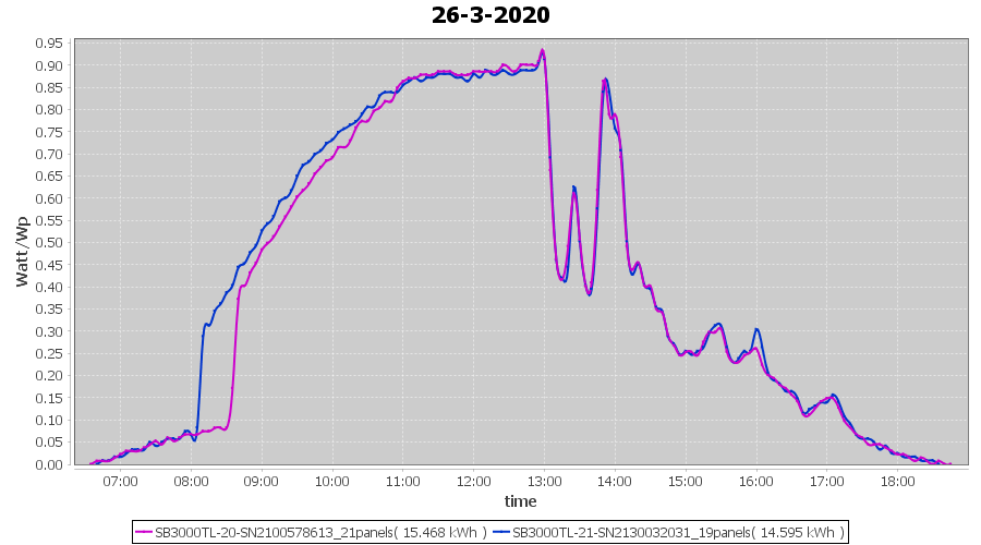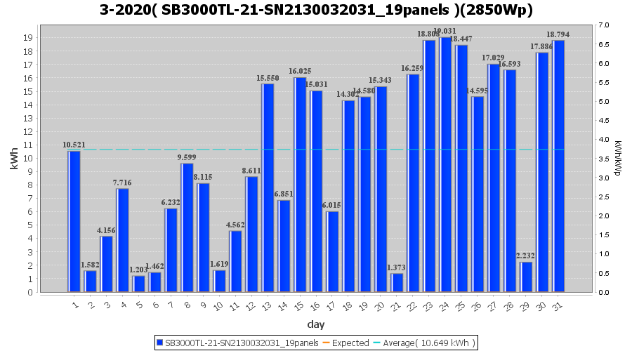 | 26-3-2020 | kWh | Sum | W/Wp | 30.063 | 6000 | 5.0 | 13.904 | € 10.82 | 4.4 |