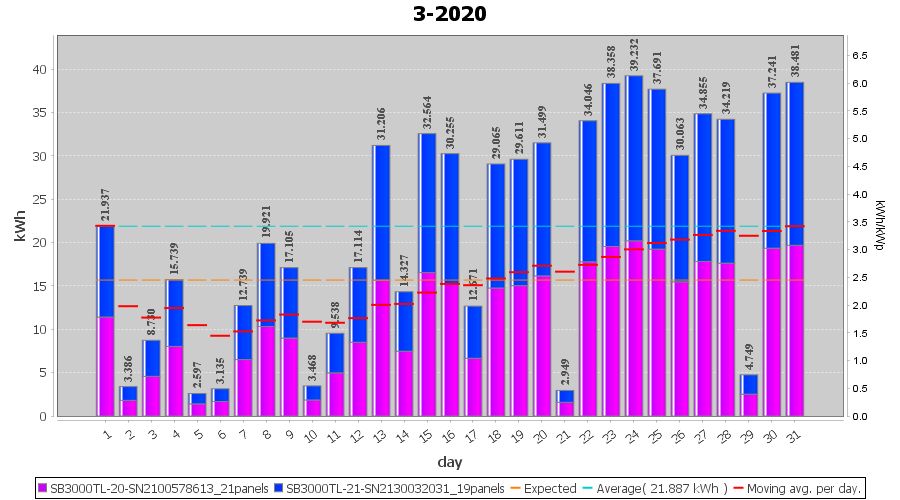 | 31-3-2020 | kWh | Sum | W/Wp | 38.481 | 6000 | 6.4 | 17.797 | € 13.85 | 5.7 |