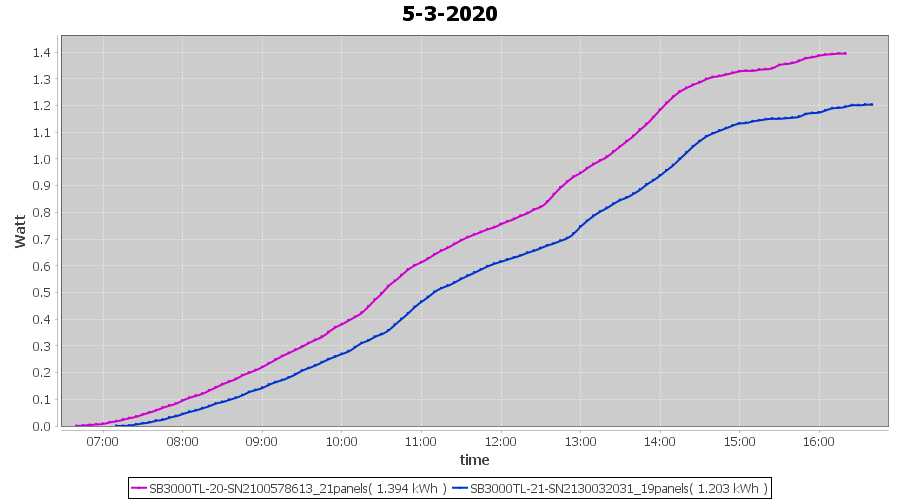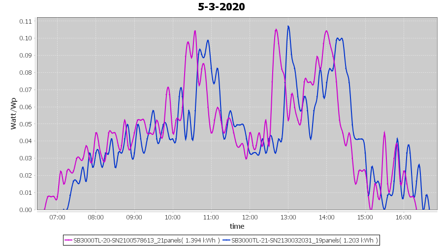 | 5-3-2020 | kWh | Sum | W/Wp | 2.597 | 6000 | 0.4 | 1.201 | € 0.93 | 0.4 |