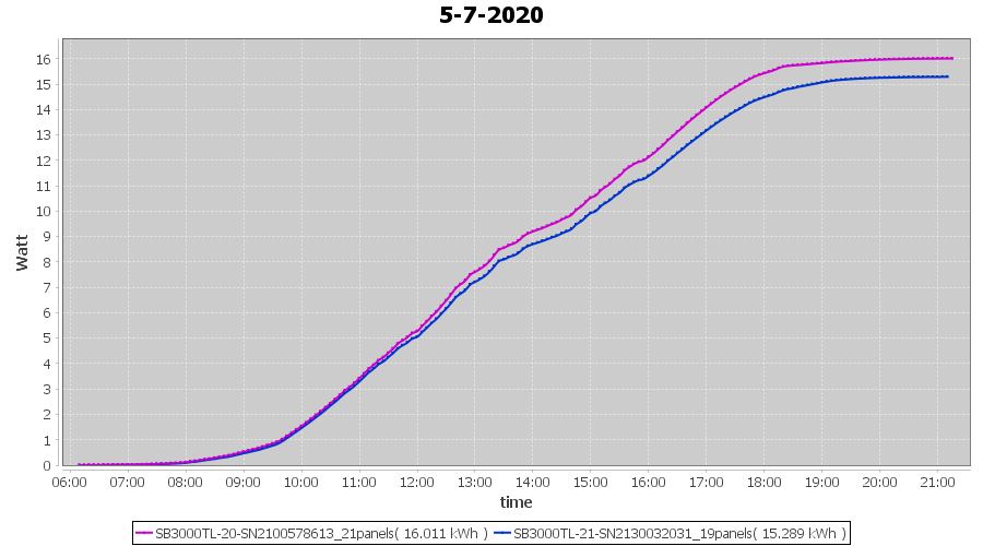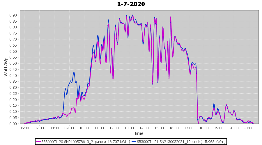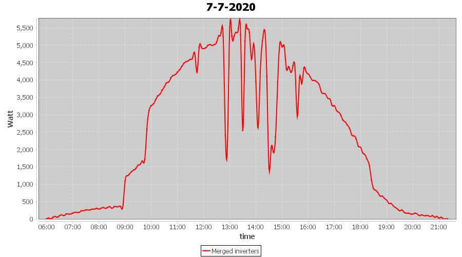 | 7-7-2020 | kWh | Sum | W/Wp | 36.074 | 6000 | 6.0 | 16.684 | € 12.98 | 3.9 |