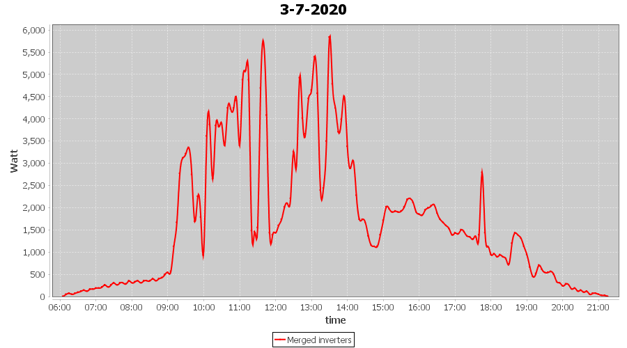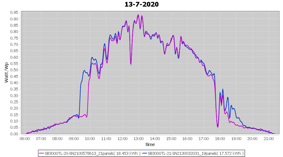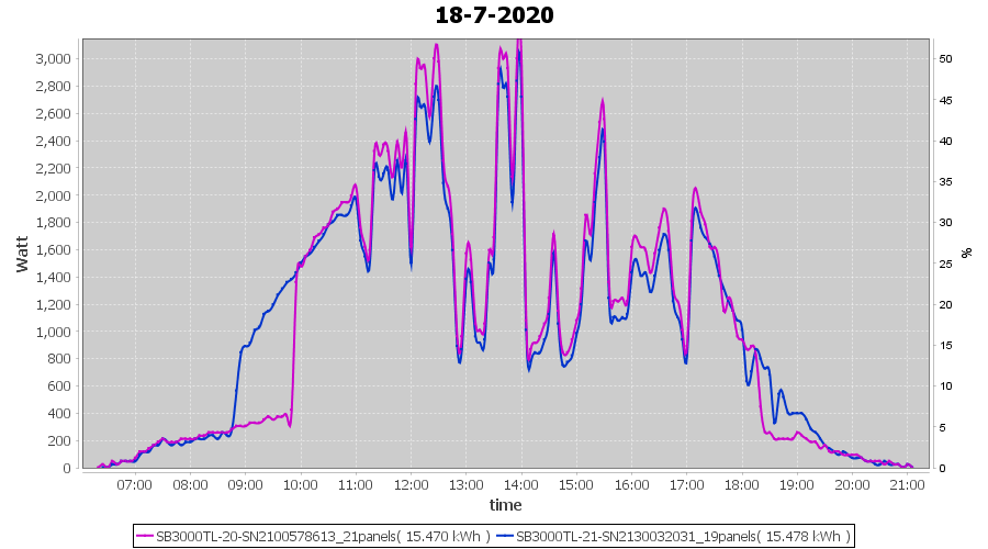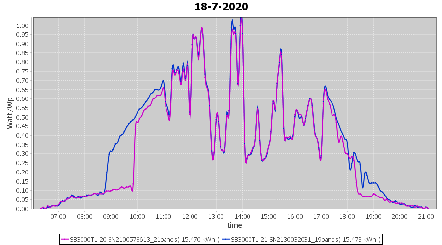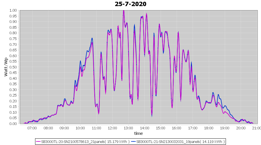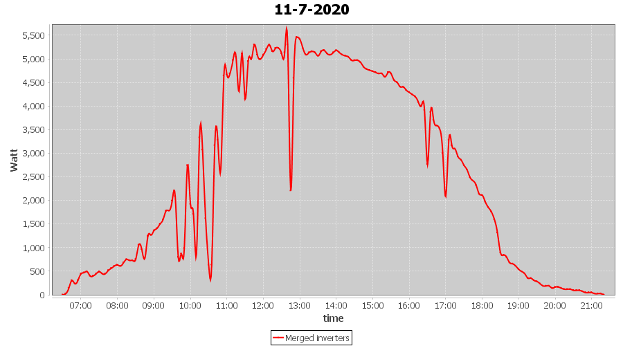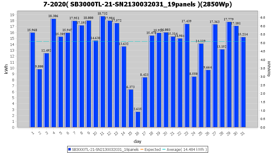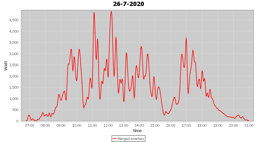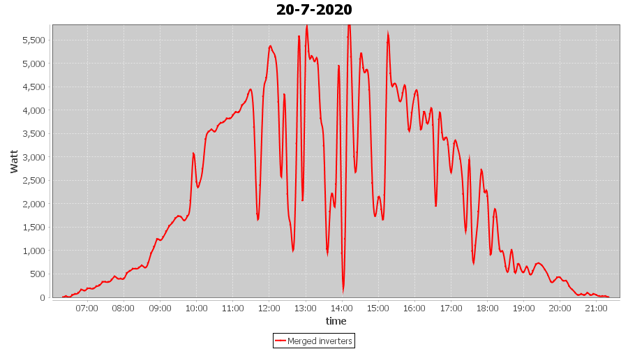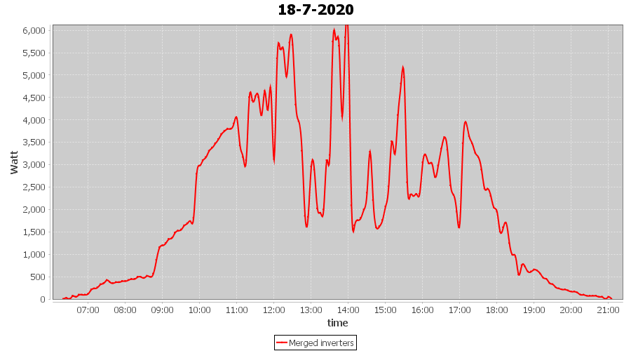| 18-7-2020 | kWh | Sum | W/Wp | 30.948 | 6000 | 5.2 | 14.313 | € 11.14 | 3.4 |