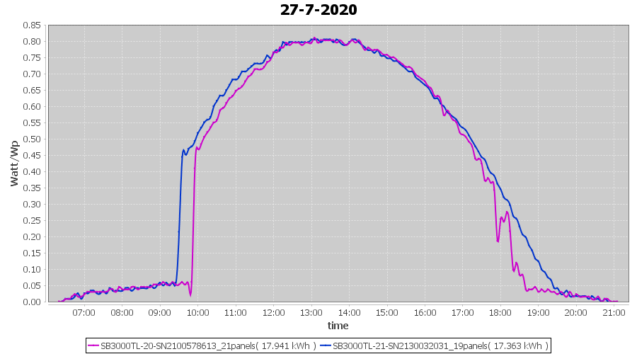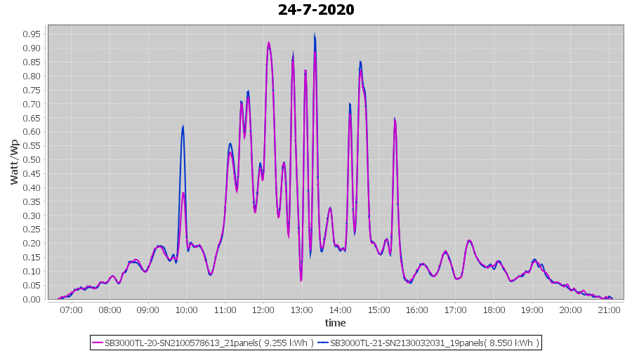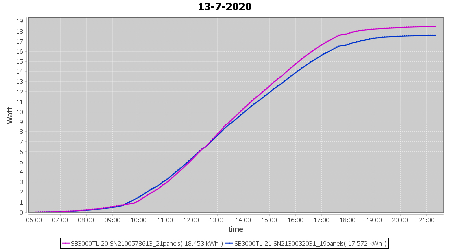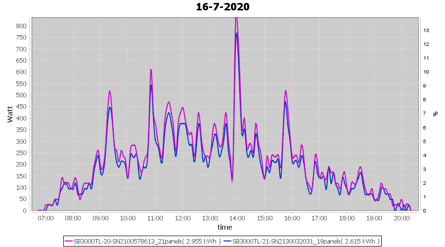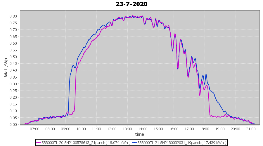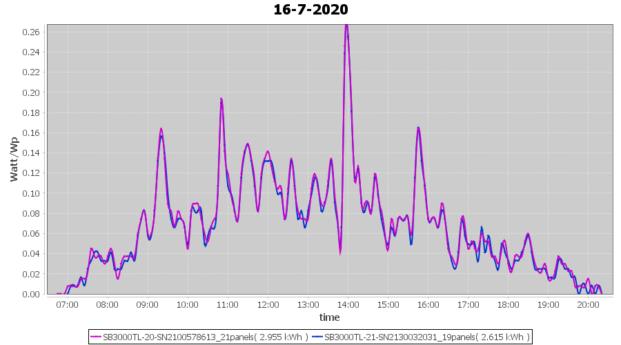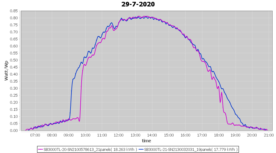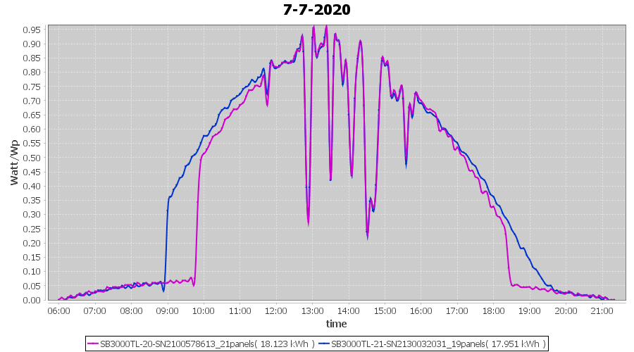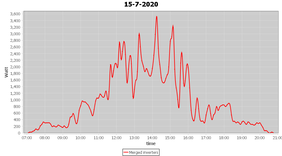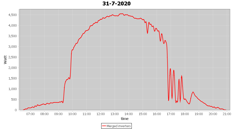 | 18-7-2020 | kWh | Sum | W/Wp | 30.948 | 6000 | 5.2 | 14.313 | € 11.14 | 3.4 |