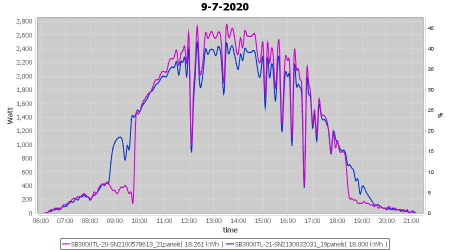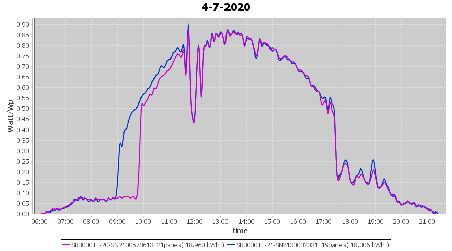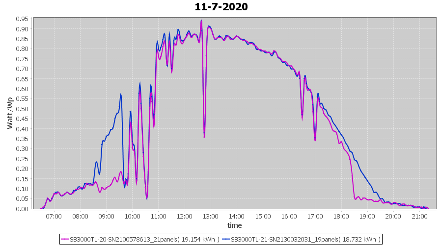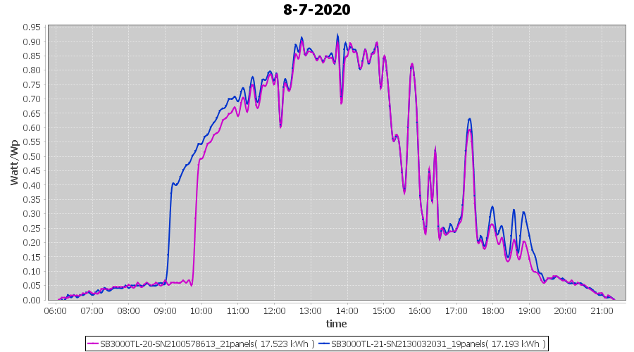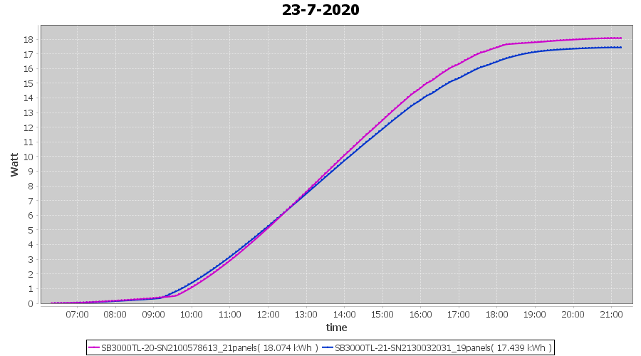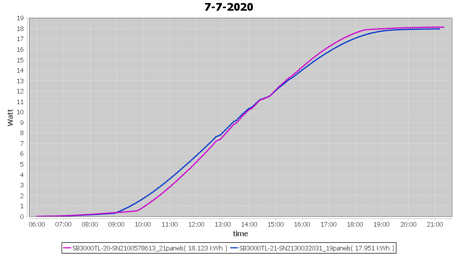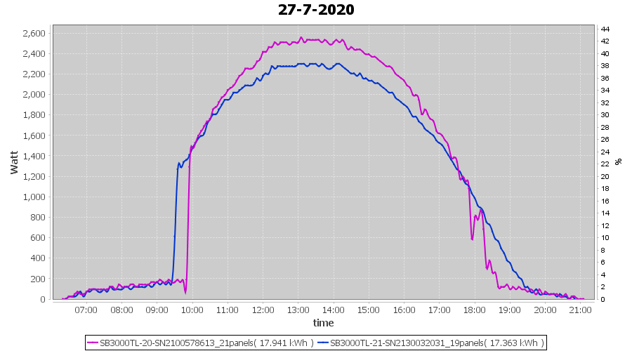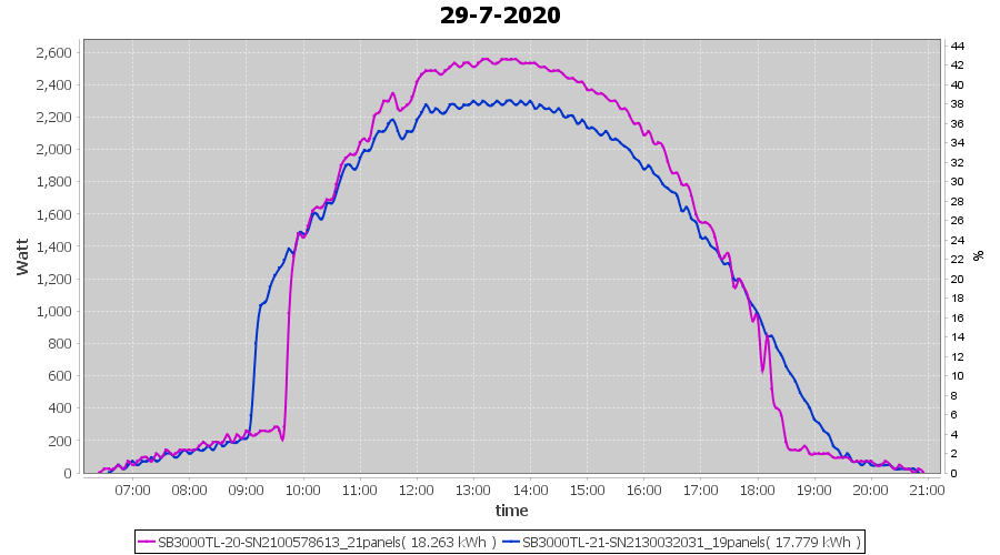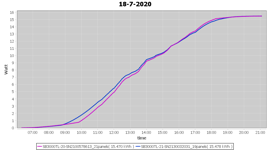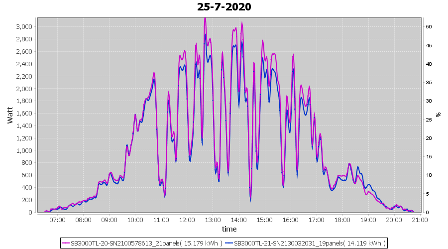 | 18-7-2020 | kWh | Sum | W/Wp | 30.948 | 6000 | 5.2 | 14.313 | € 11.14 | 3.4 |
