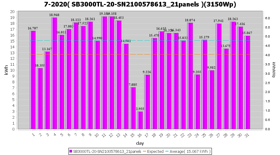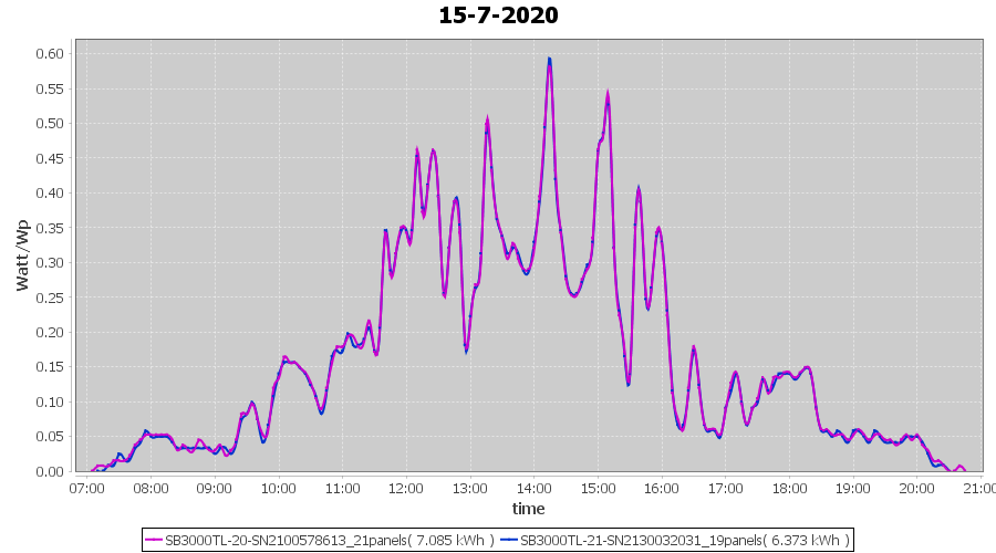 | 15-7-2020 | kWh | Sum | W/Wp | 13.458 | 6000 | 2.2 | 6.224 | € 4.84 | 1.5 |