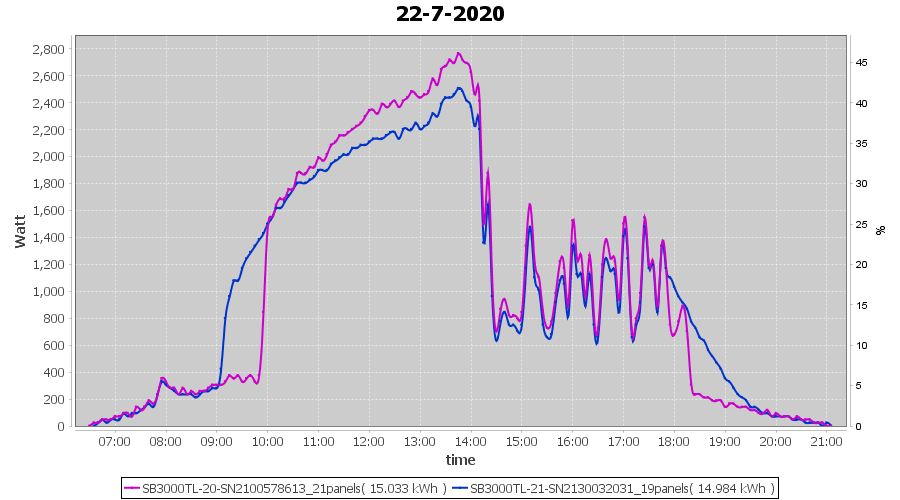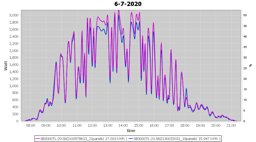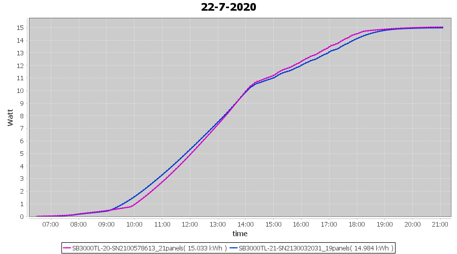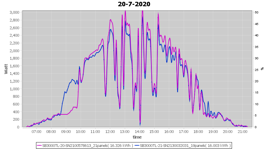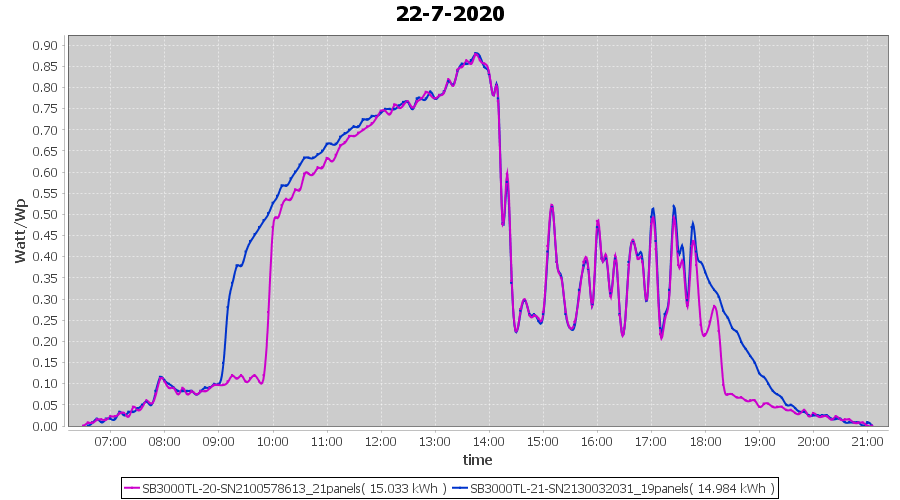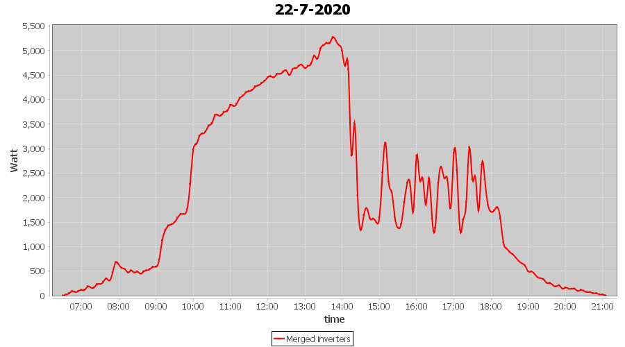 | 22-7-2020 | kWh | Sum | W/Wp | 30.017 | 6000 | 5.0 | 13.883 | € 10.80 | 3.3 |