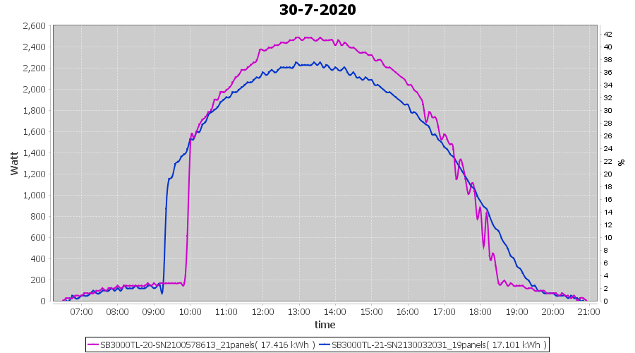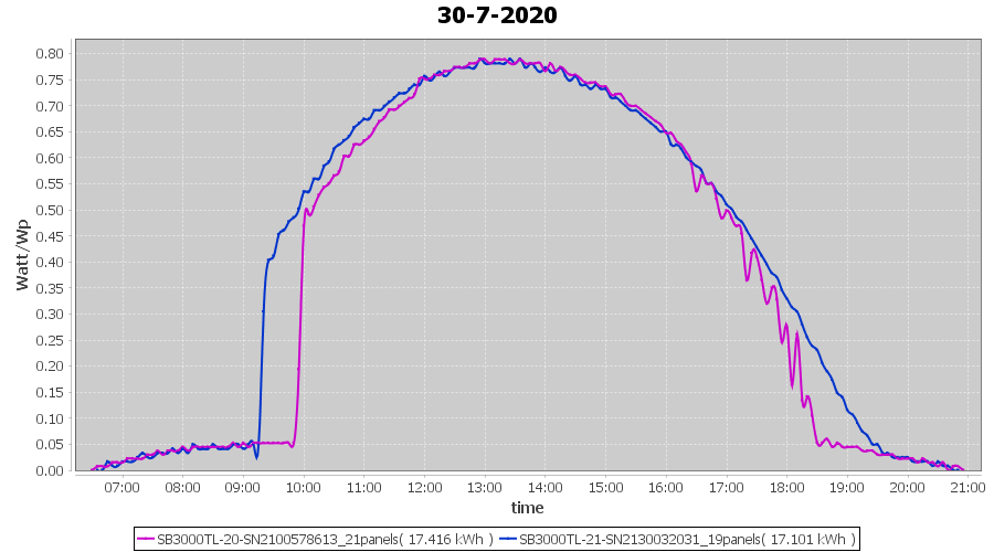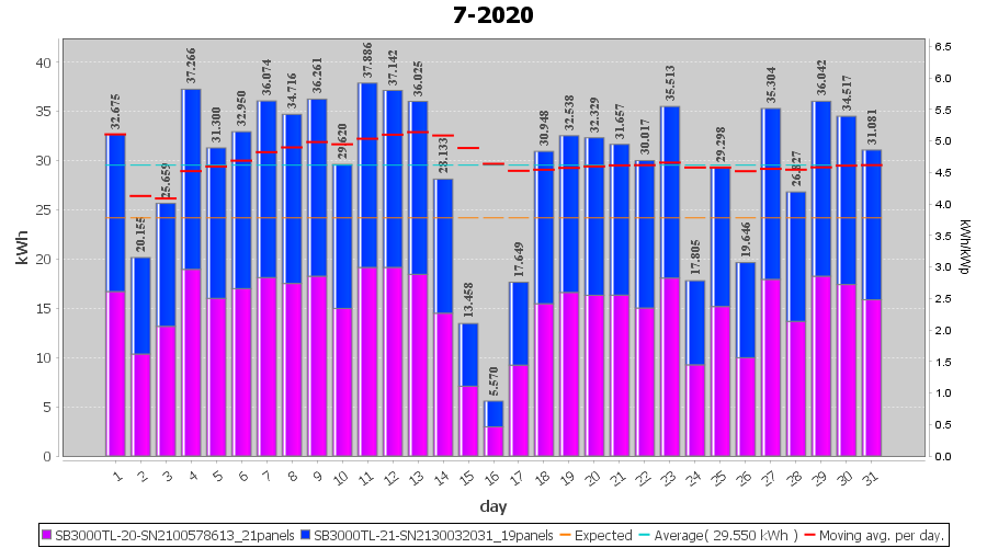 | 30-7-2020 | kWh | Sum | W/Wp | 34.517 | 6000 | 5.8 | 15.964 | € 12.42 | 3.8 |