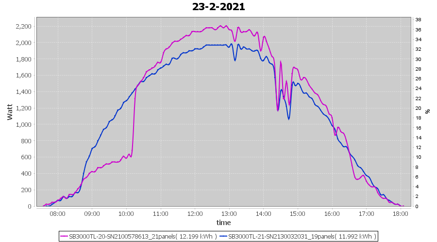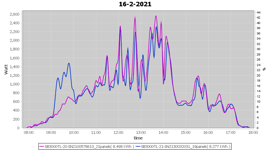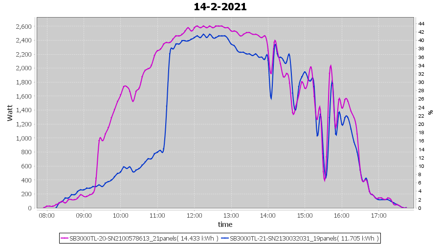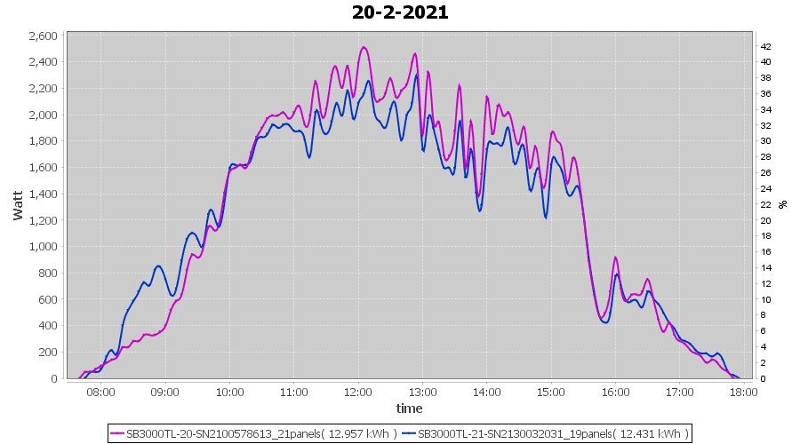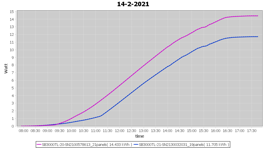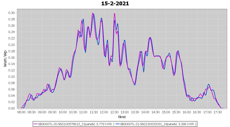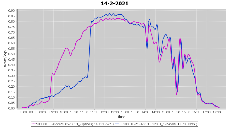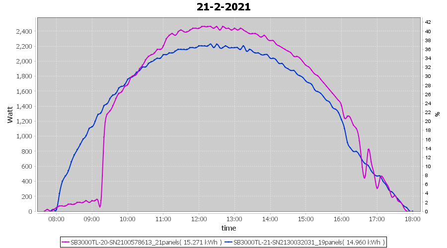 | 14-2-2021 | kWh | Sum | W/Wp | 26.138 | 6000 | 4.4 | 12.089 | € 9.40 | 7.1 |