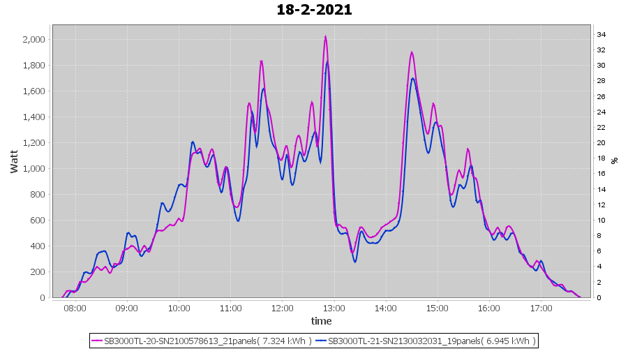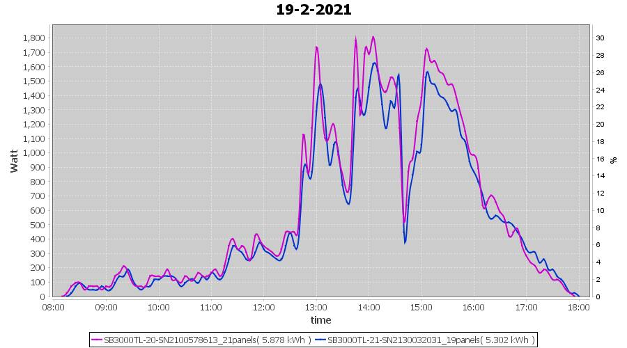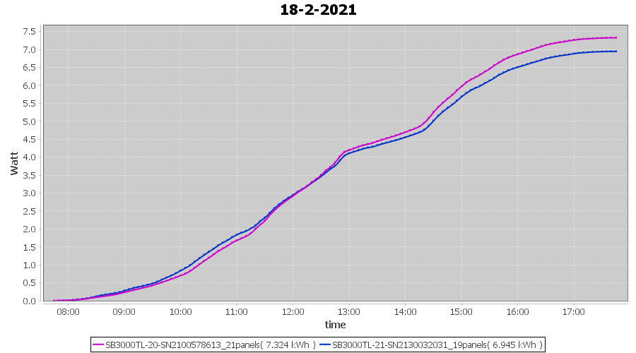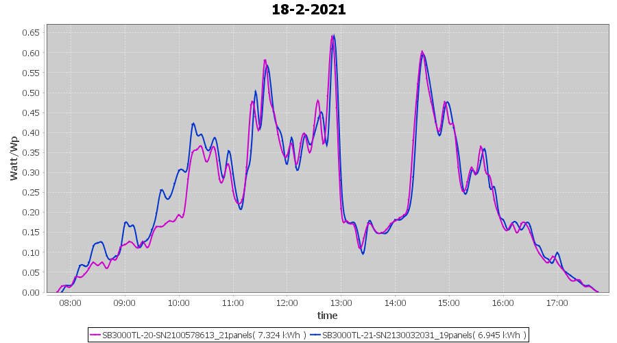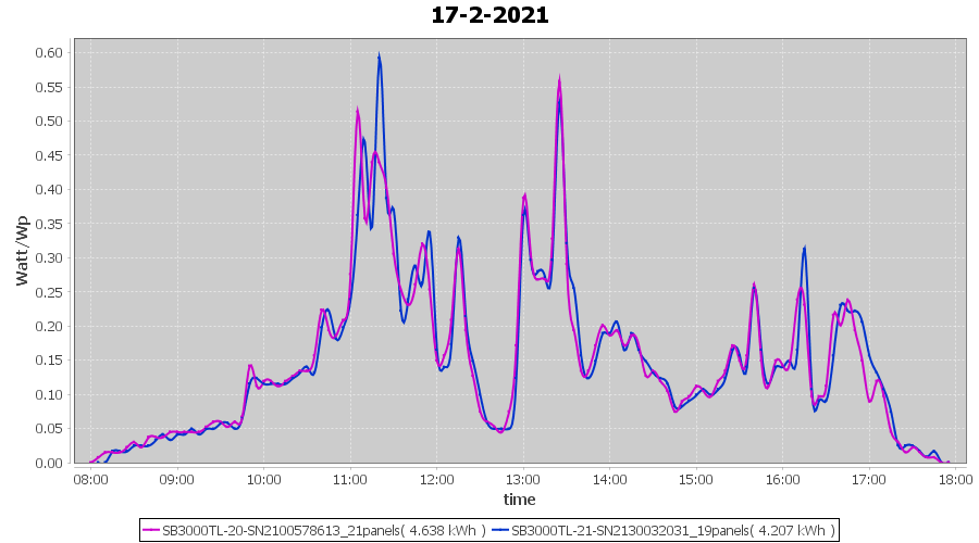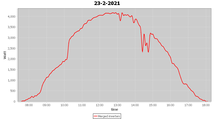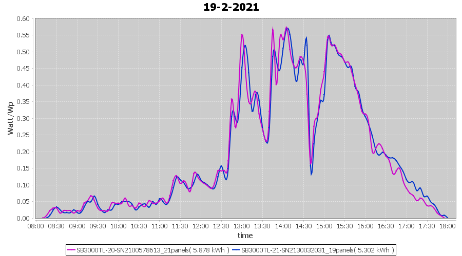 | 18-2-2021 | kWh | Sum | W/Wp | 14.269 | 6000 | 2.4 | 6.599 | € 5.13 | 3.9 |