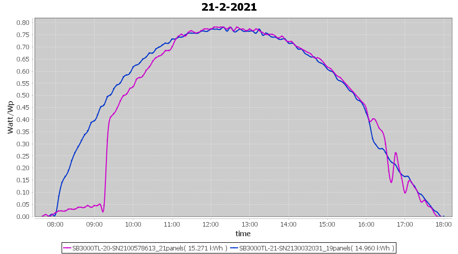 | 21-2-2021 | kWh | Sum | W/Wp | 30.231 | 6000 | 5.0 | 13.982 | € 10.87 | 8.2 |