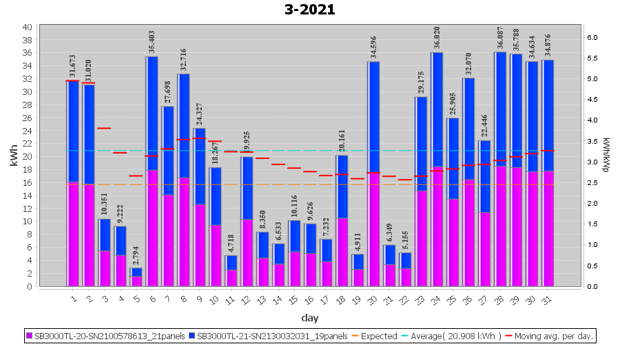 | 31-3-2021 | kWh | Sum | W/Wp | 34.876 | 6000 | 5.8 | 16.130 | € 12.54 | 5.4 |
