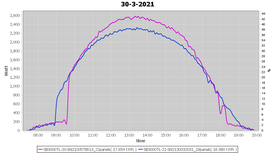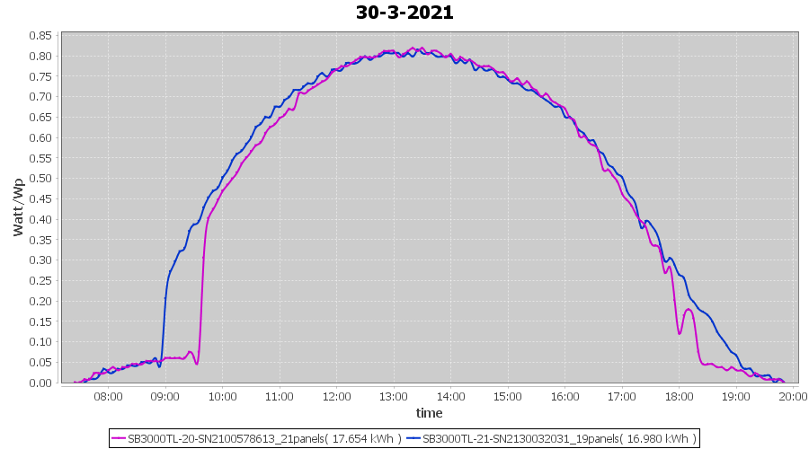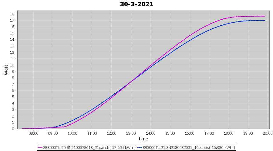 | 30-3-2021 | kWh | Sum | W/Wp | 34.634 | 6000 | 5.8 | 16.018 | € 12.45 | 5.3 |