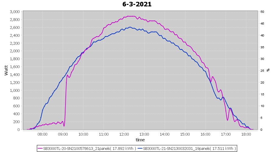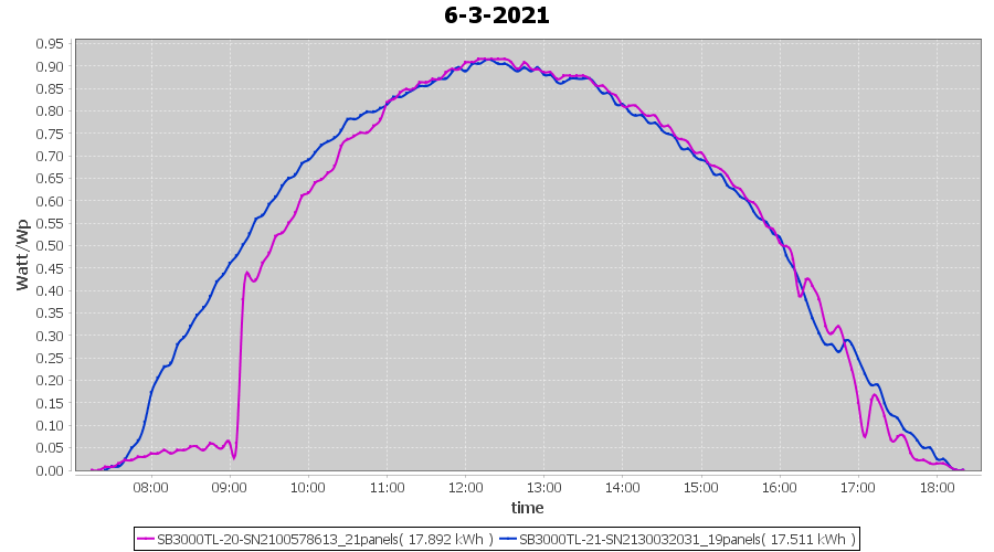 | 6-3-2021 | kWh | Sum | W/Wp | 35.403 | 6000 | 5.9 | 16.374 | € 12.73 | 5.5 |