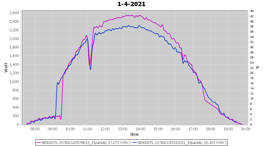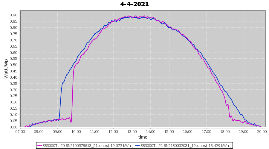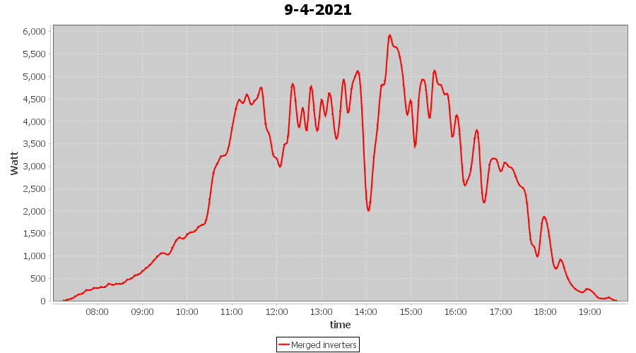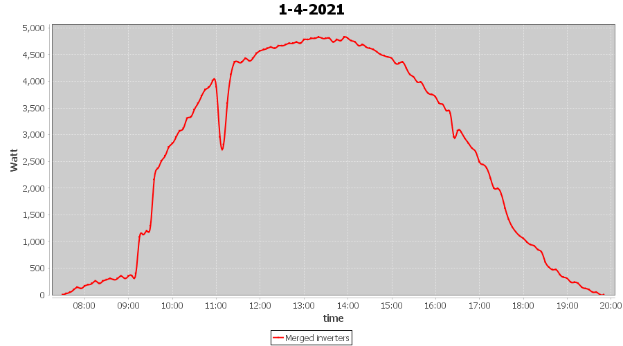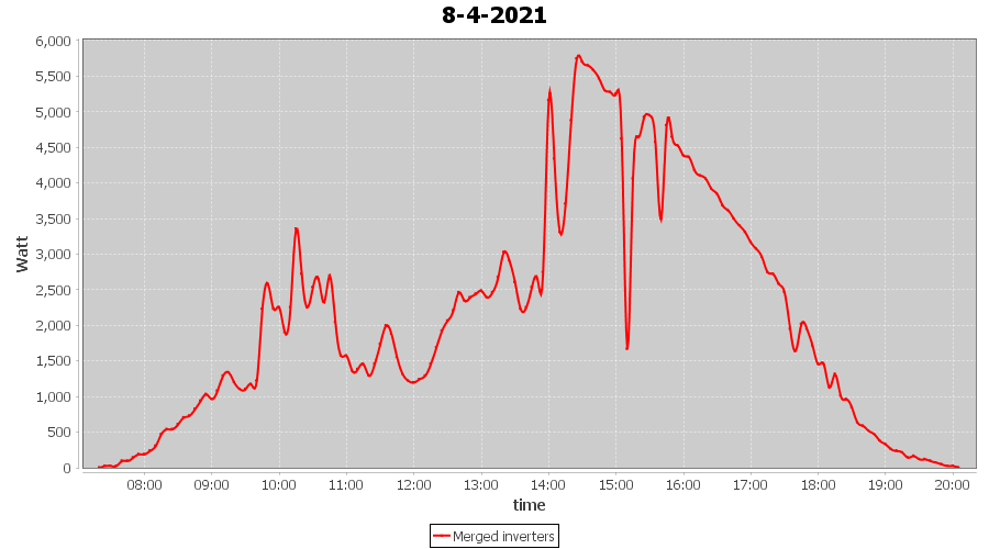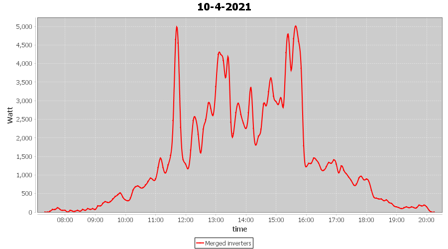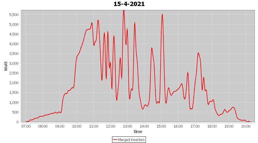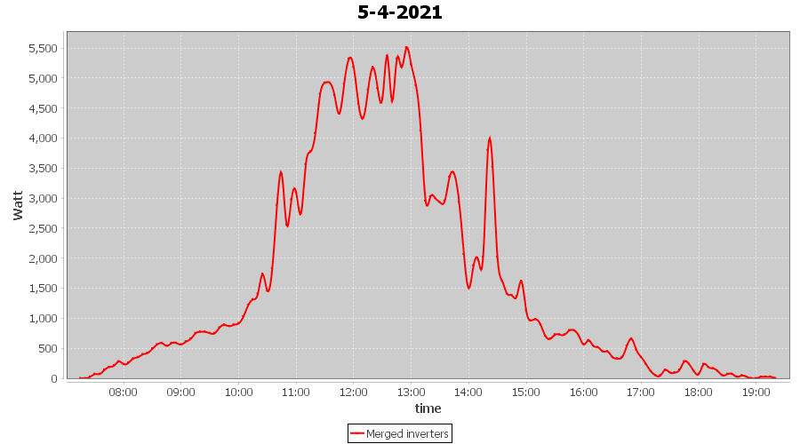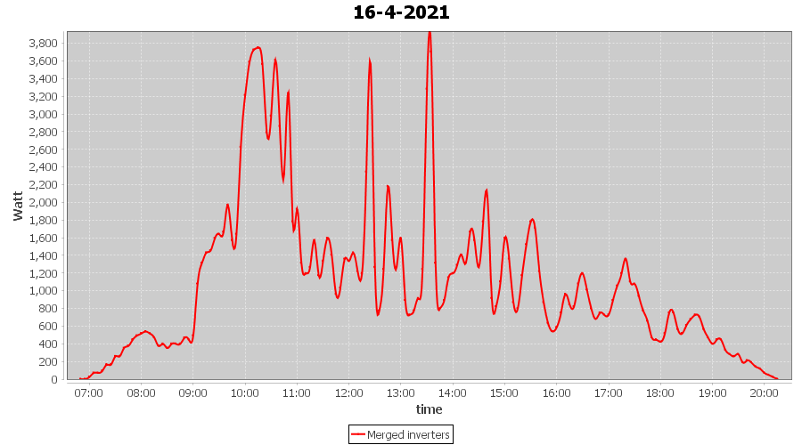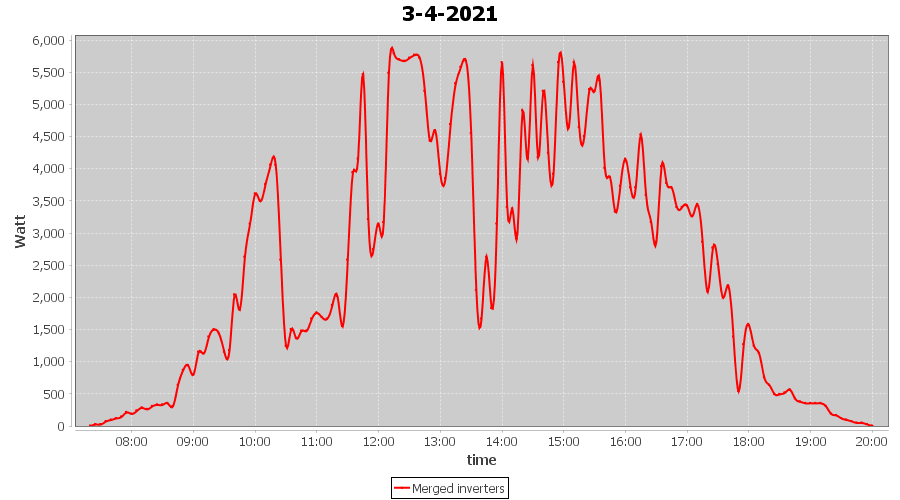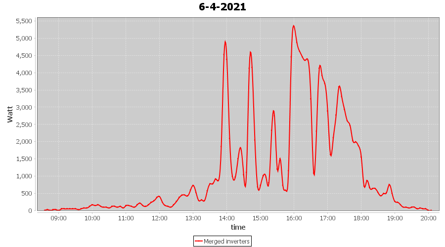 | 4-4-2021 | kWh | Sum | W/Wp | 37.501 | 6000 | 6.3 | 17.344 | € 13.48 | 4.9 |