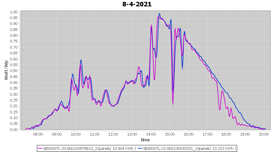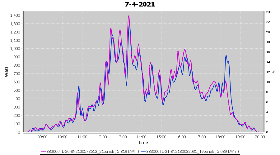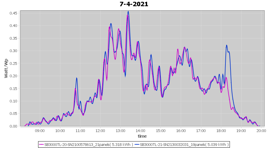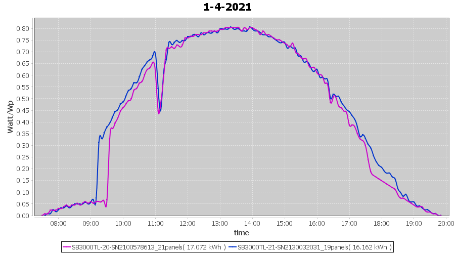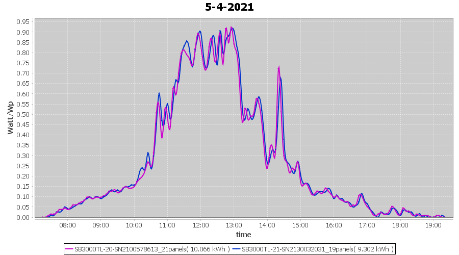 | 7-4-2021 | kWh | Sum | W/Wp | 10.357 | 6000 | 1.7 | 4.790 | € 3.72 | 1.3 |