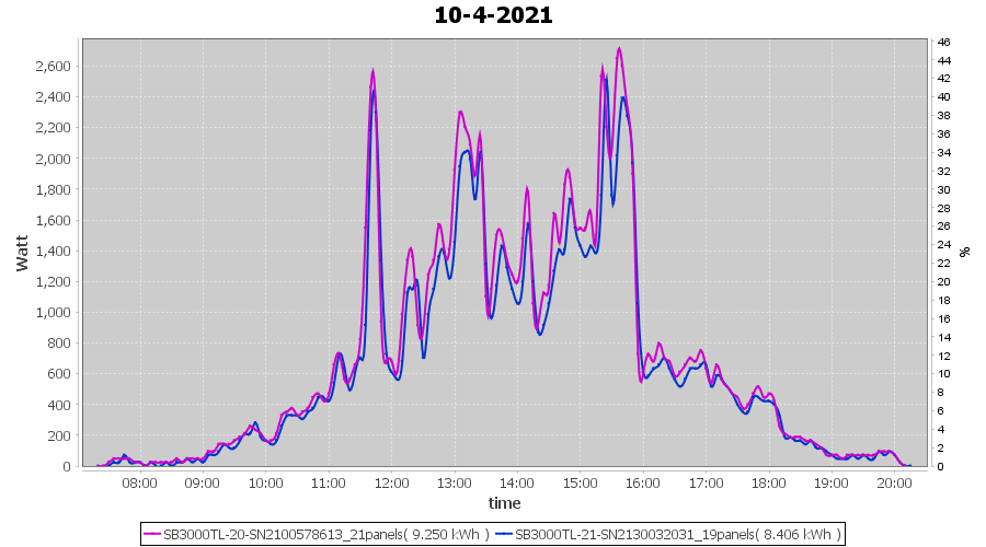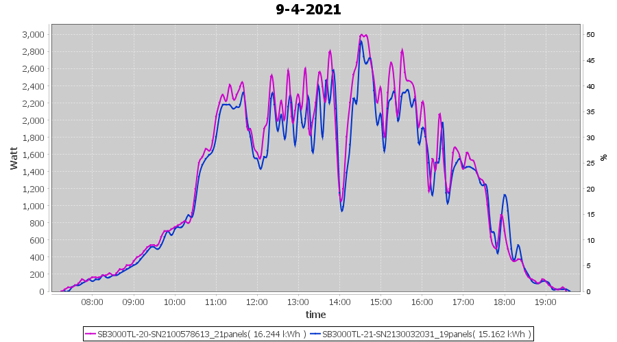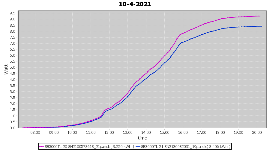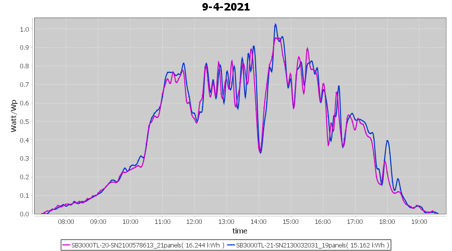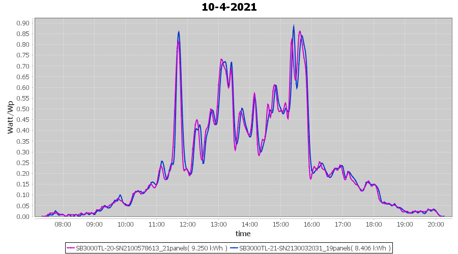| 9-4-2021 | kWh | Sum | W/Wp | 31.406 | 6000 | 5.2 | 14.525 | € 11.29 | 4.1 |