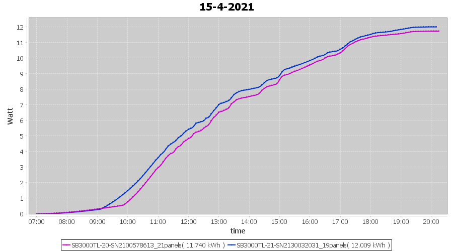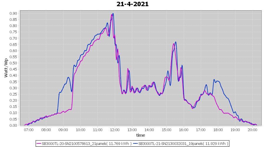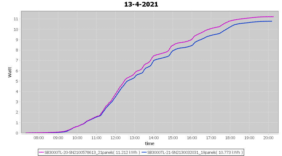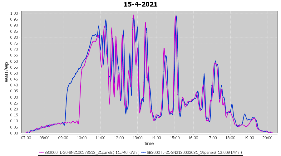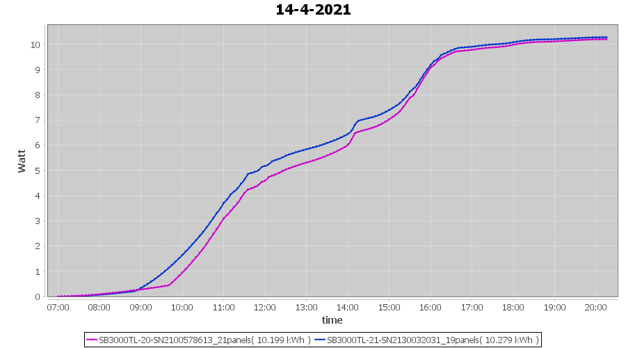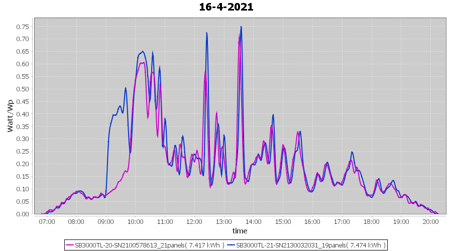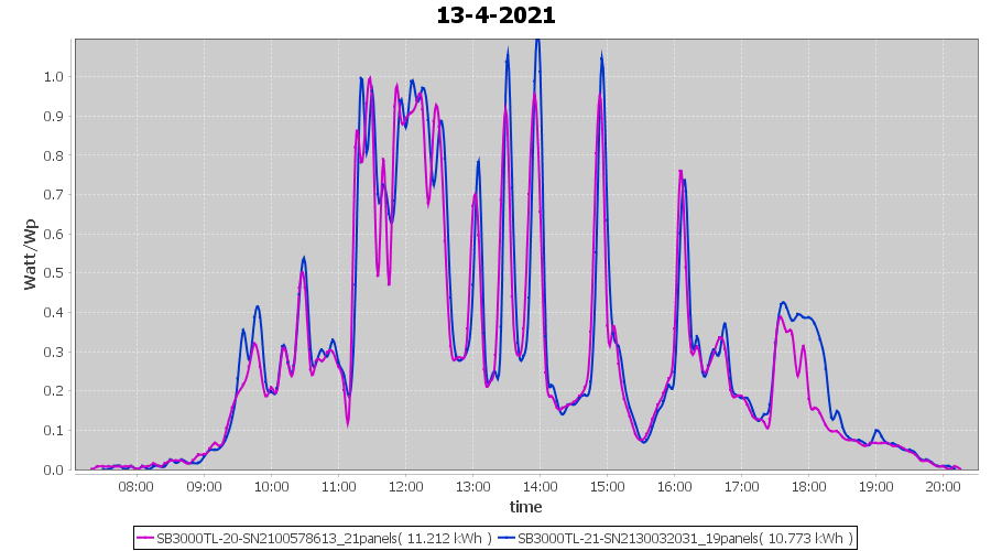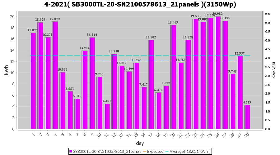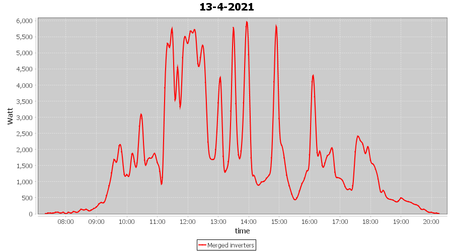 | 13-4-2021 | kWh | Sum | W/Wp | 21.985 | 6000 | 3.7 | 10.168 | € 7.90 | 2.9 |