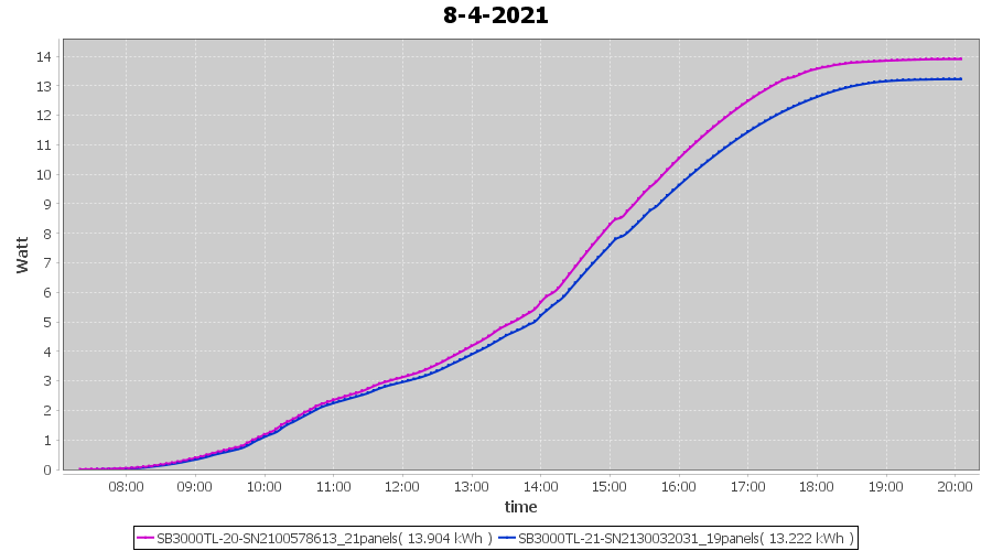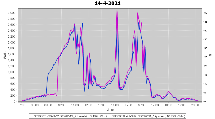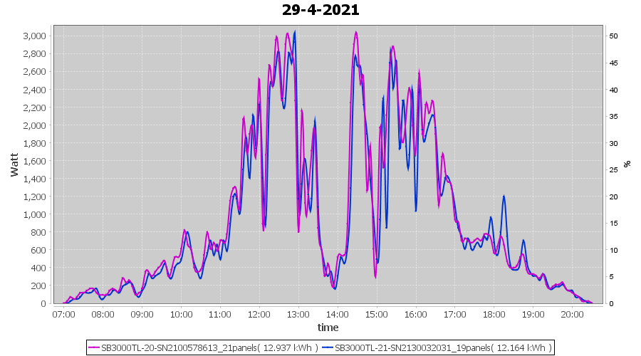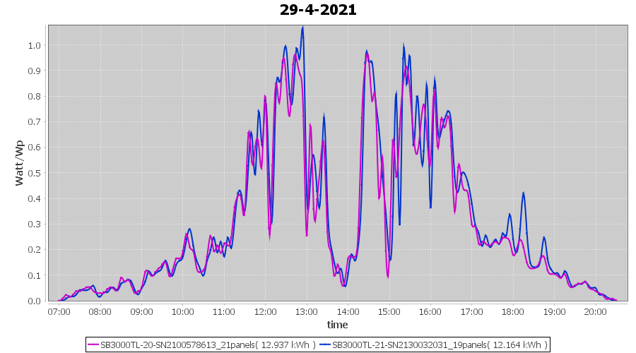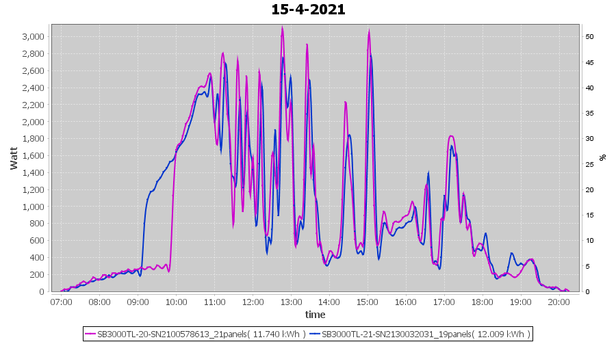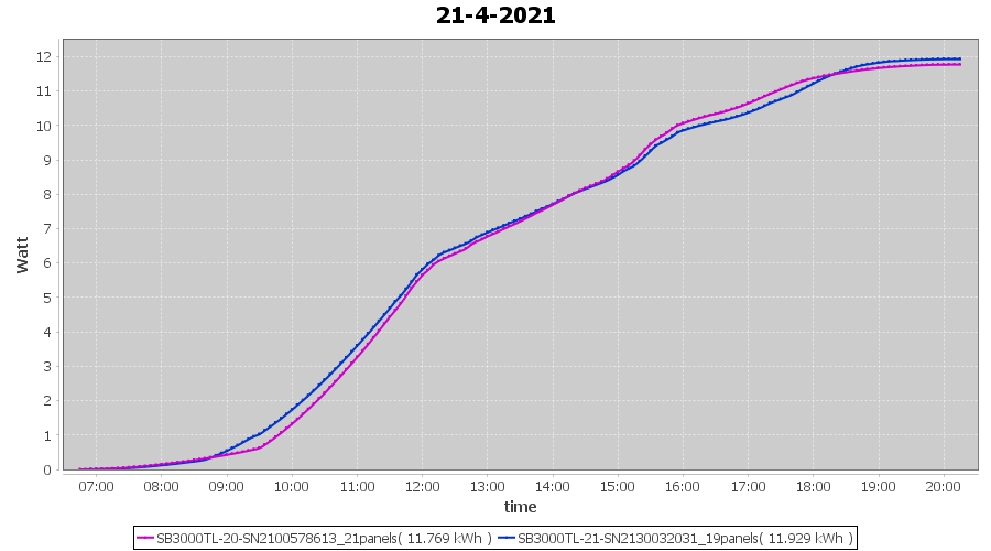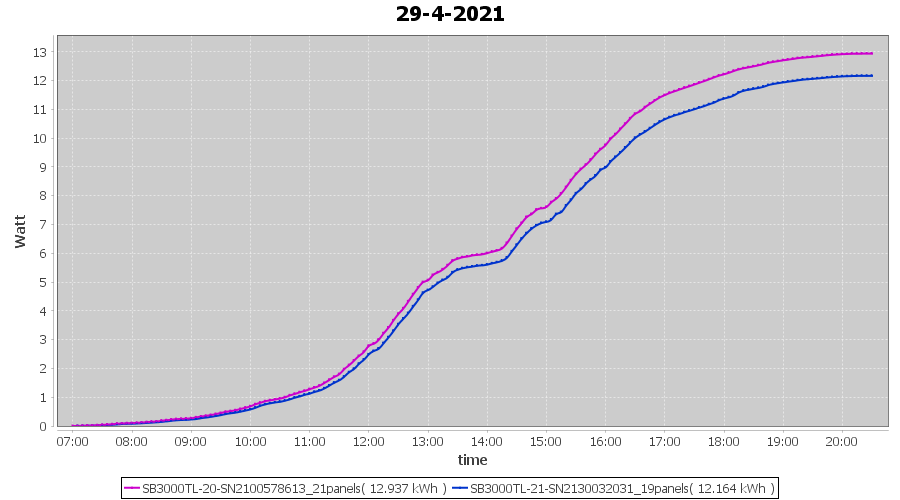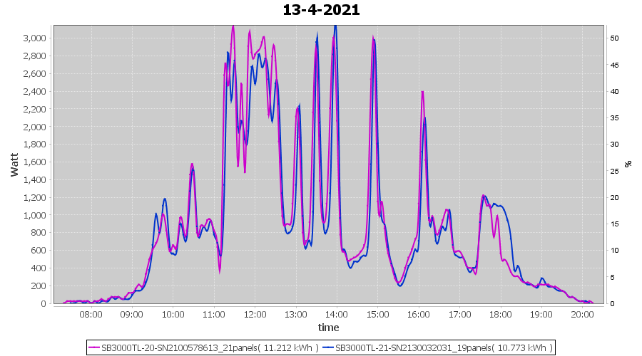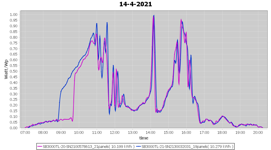 | 13-4-2021 | kWh | Sum | W/Wp | 21.985 | 6000 | 3.7 | 10.168 | € 7.90 | 2.9 |