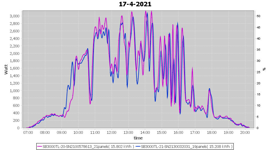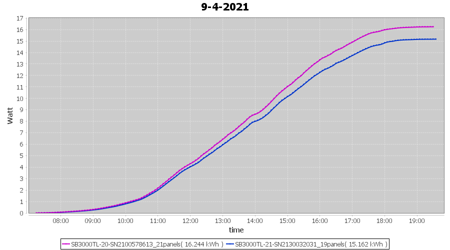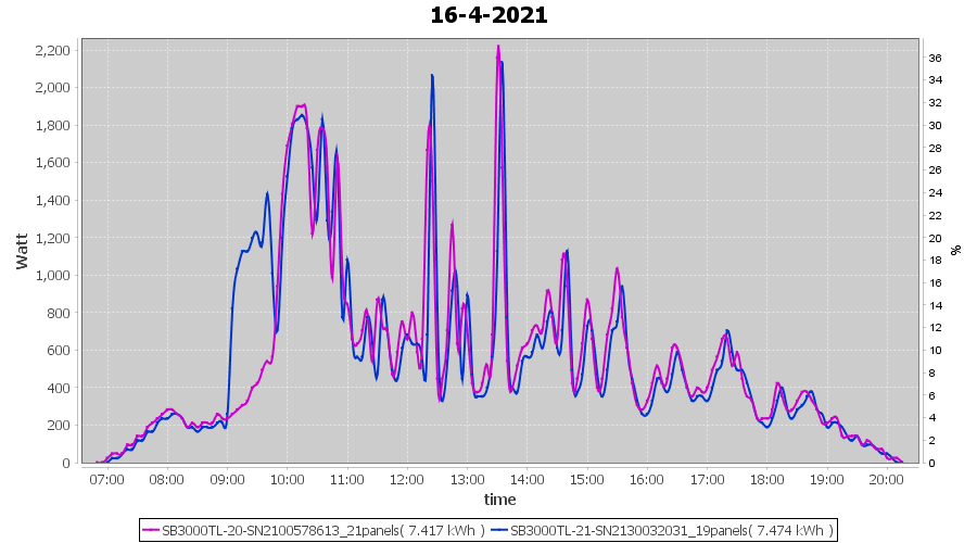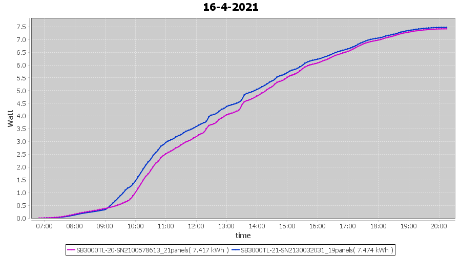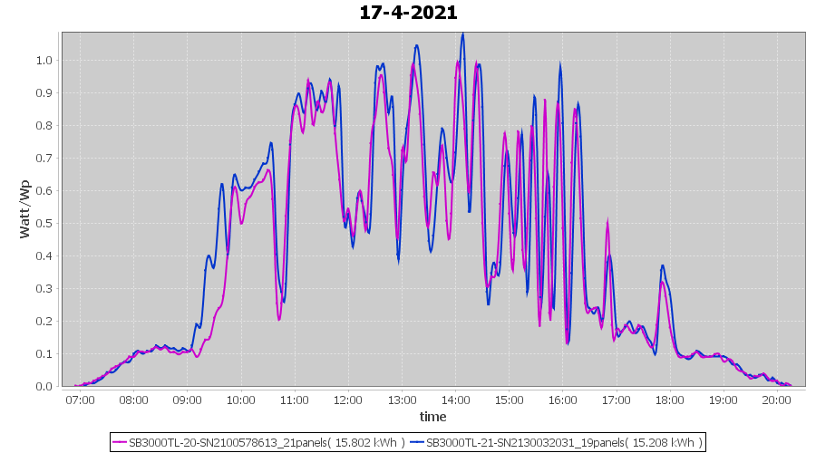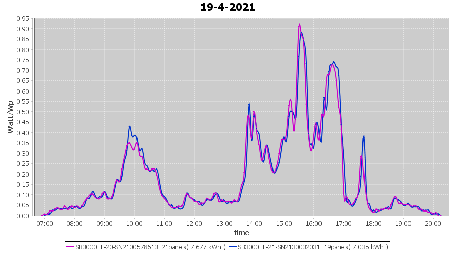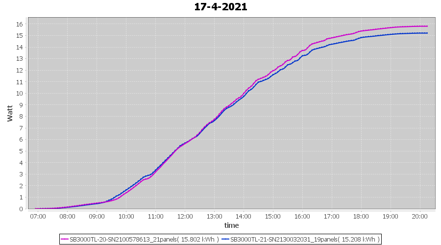| 16-4-2021 | kWh | Sum | W/Wp | 14.891 | 6000 | 2.5 | 6.887 | € 5.35 | 1.9 |