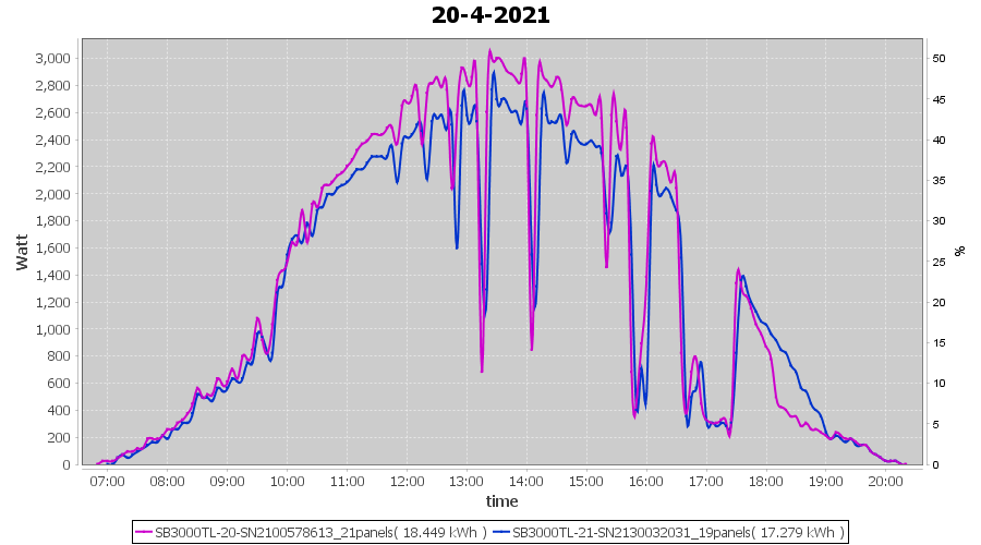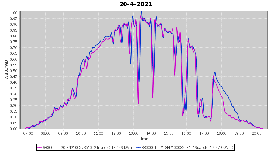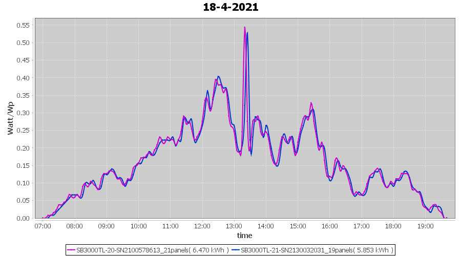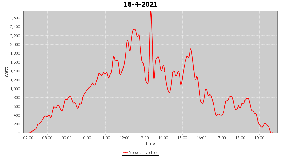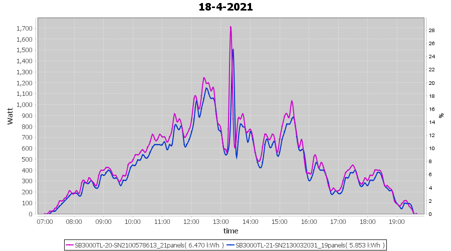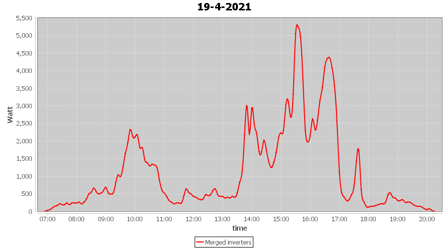 | 18-4-2021 | kWh | Sum | W/Wp | 12.323 | 6000 | 2.1 | 5.699 | € 4.43 | 1.6 |