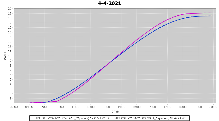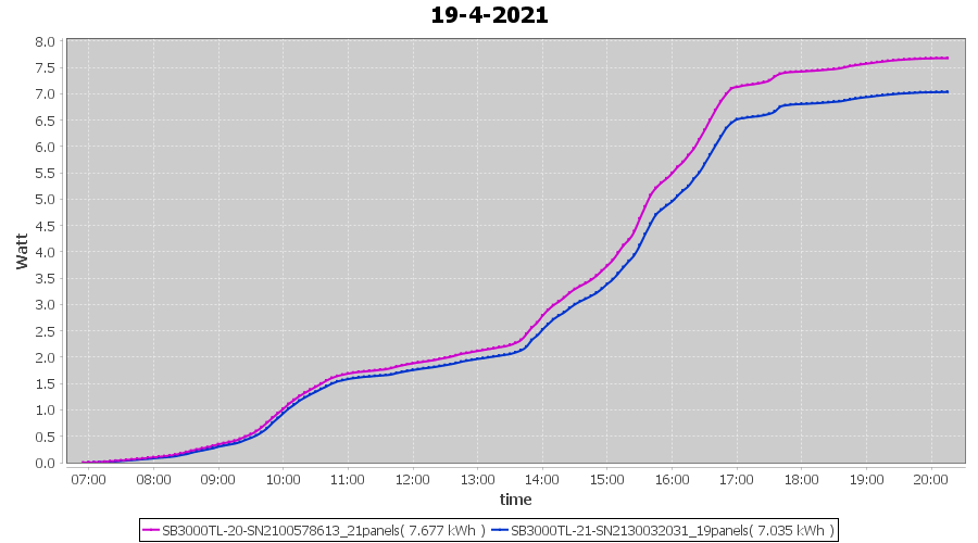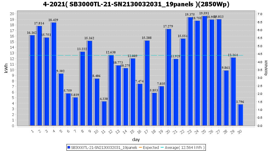 | 19-4-2021 | kWh | Sum | W/Wp | 14.712 | 6000 | 2.5 | 6.804 | € 5.29 | 1.9 |