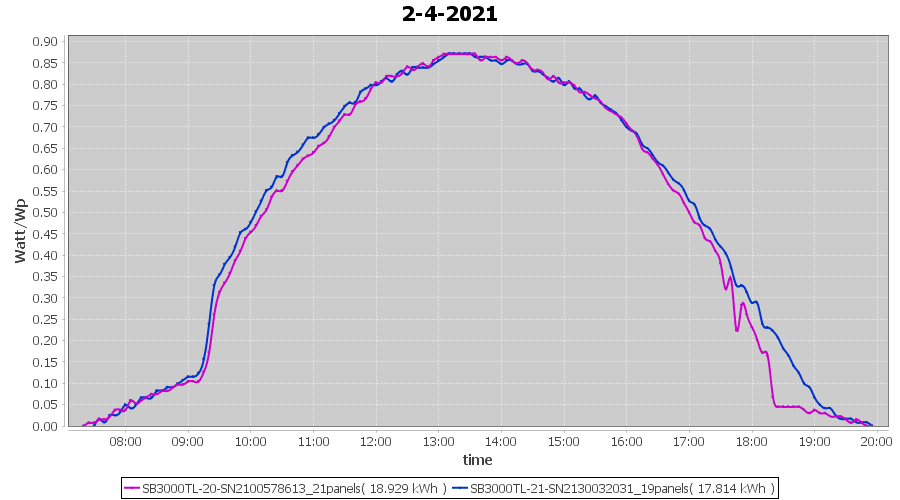 | 2-4-2021 | kWh | Sum | W/Wp | 36.743 | 6000 | 6.1 | 16.994 | € 13.21 | 4.8 |