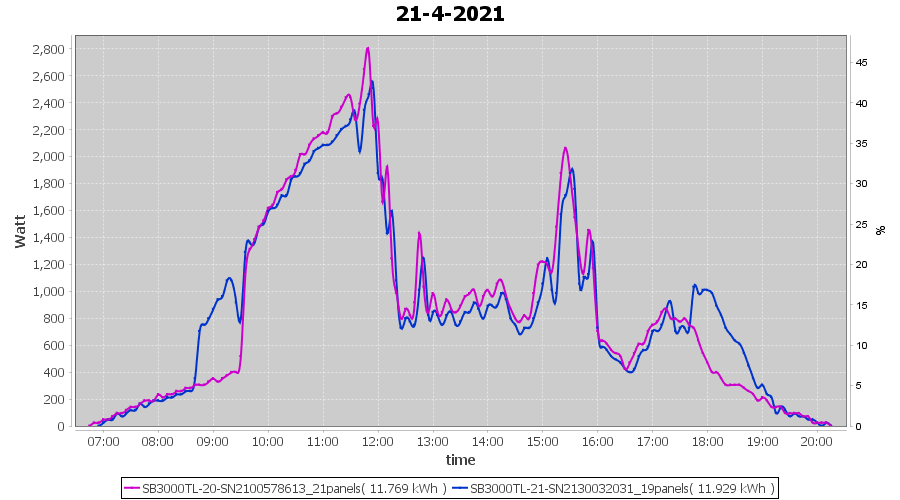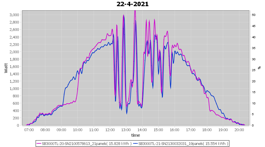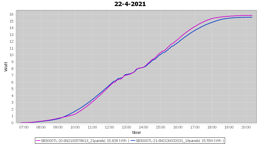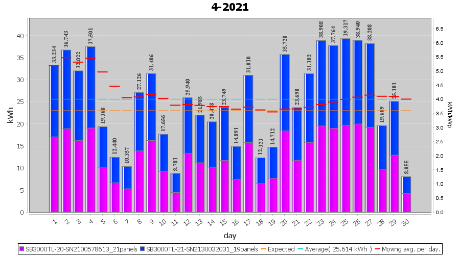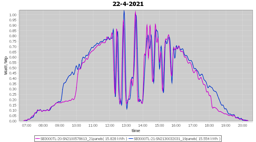 | 22-4-2021 | kWh | Sum | W/Wp | 31.382 | 6000 | 5.2 | 14.514 | € 11.28 | 4.1 |