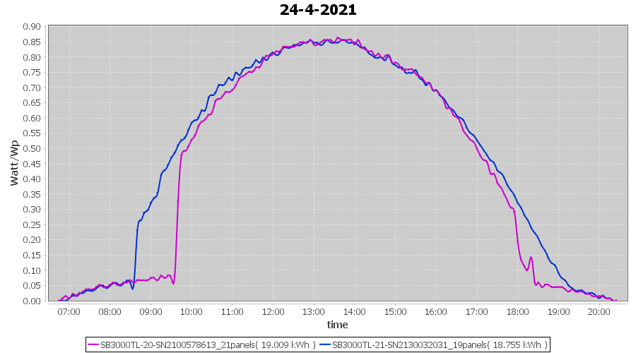 | 24-4-2021 | kWh | Sum | W/Wp | 37.764 | 6000 | 6.3 | 17.466 | € 13.58 | 4.9 |