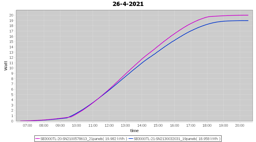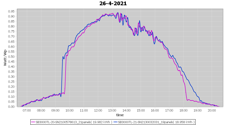 | 26-4-2021 | kWh | Sum | W/Wp | 38.940 | 6000 | 6.5 | 18.010 | € 14.00 | 5.1 |