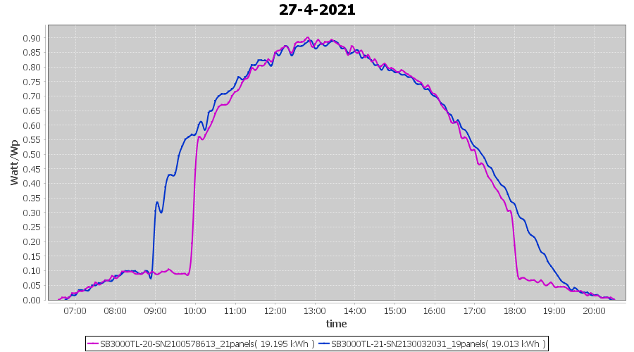 | 27-4-2021 | kWh | Sum | W/Wp | 38.208 | 6000 | 6.4 | 17.671 | € 13.74 | 5.0 |