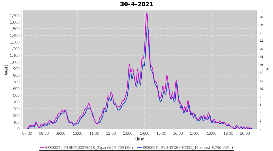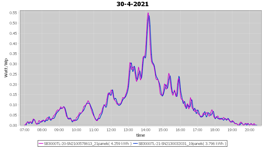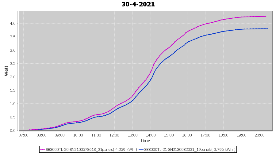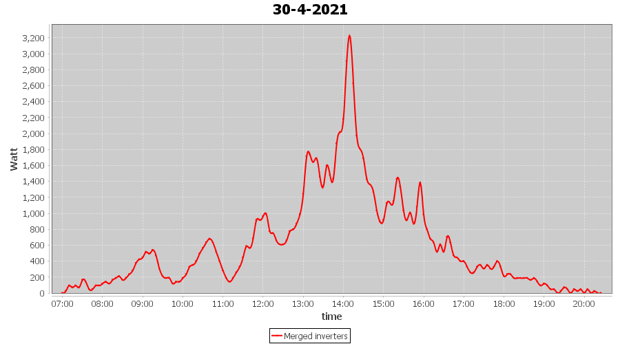 | 30-4-2021 | kWh | Sum | W/Wp | 8.055 | 6000 | 1.3 | 3.725 | € 2.90 | 1.0 |
