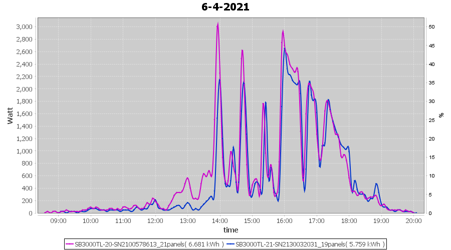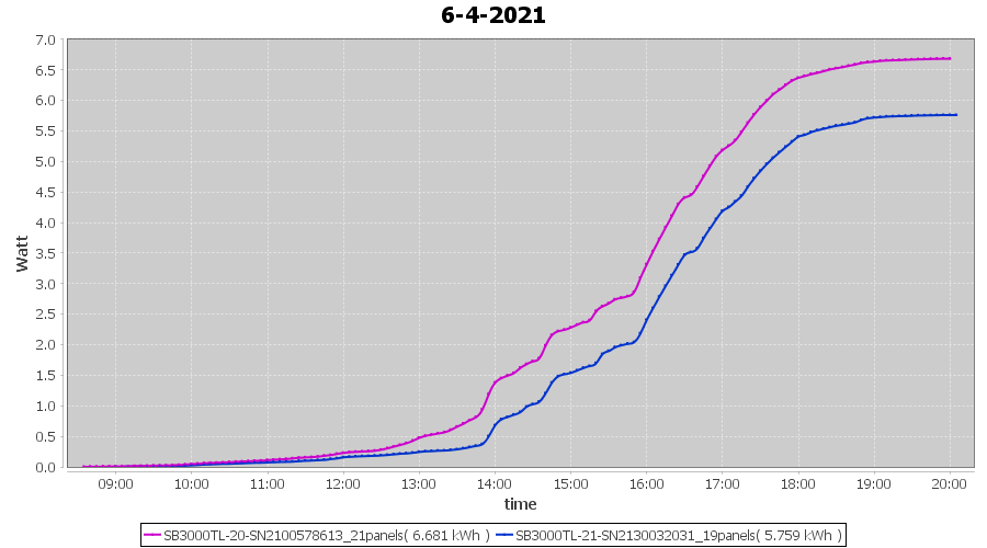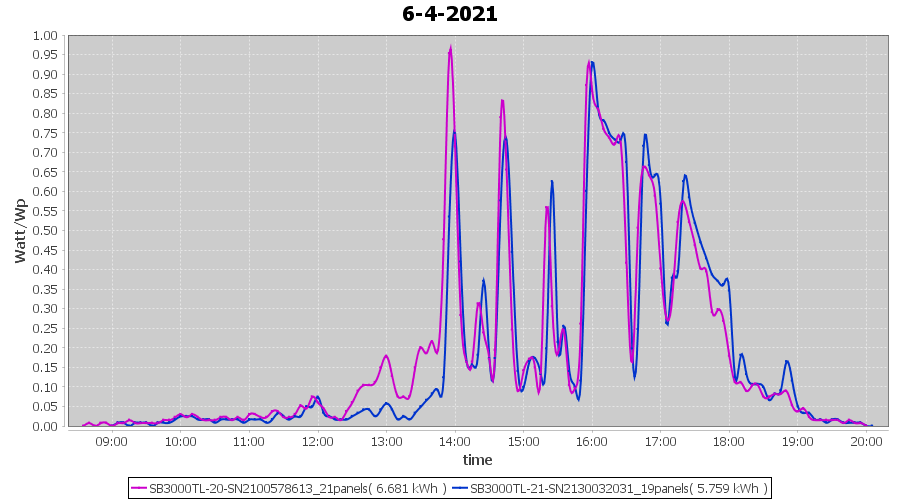 | 6-4-2021 | kWh | Sum | W/Wp | 12.440 | 6000 | 2.1 | 5.753 | € 4.47 | 1.6 |