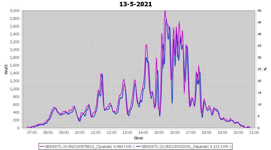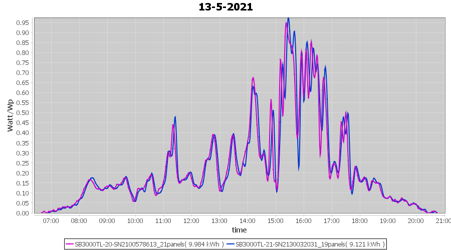 | 13-5-2021 | kWh | Sum | W/Wp | 19.105 | 6000 | 3.2 | 8.836 | € 6.87 | 2.6 |