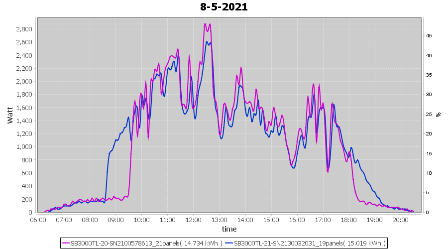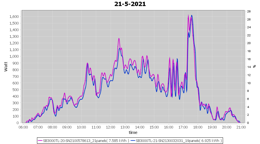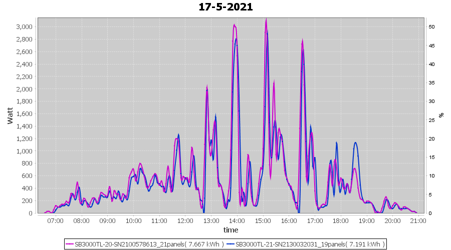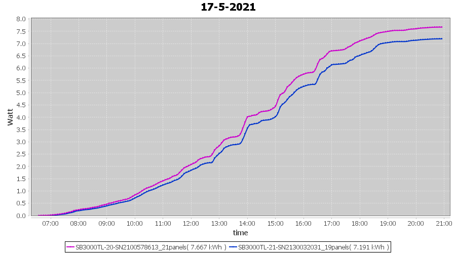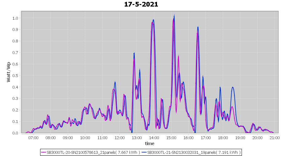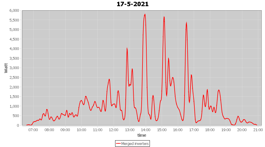 | 17-5-2021 | kWh | Sum | W/Wp | 14.858 | 6000 | 2.5 | 6.872 | € 5.34 | 2.0 |