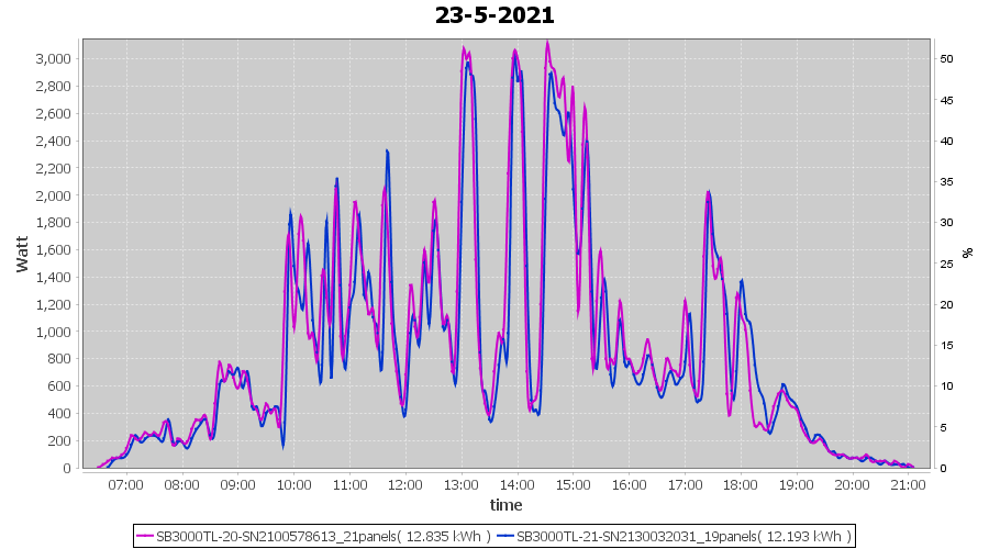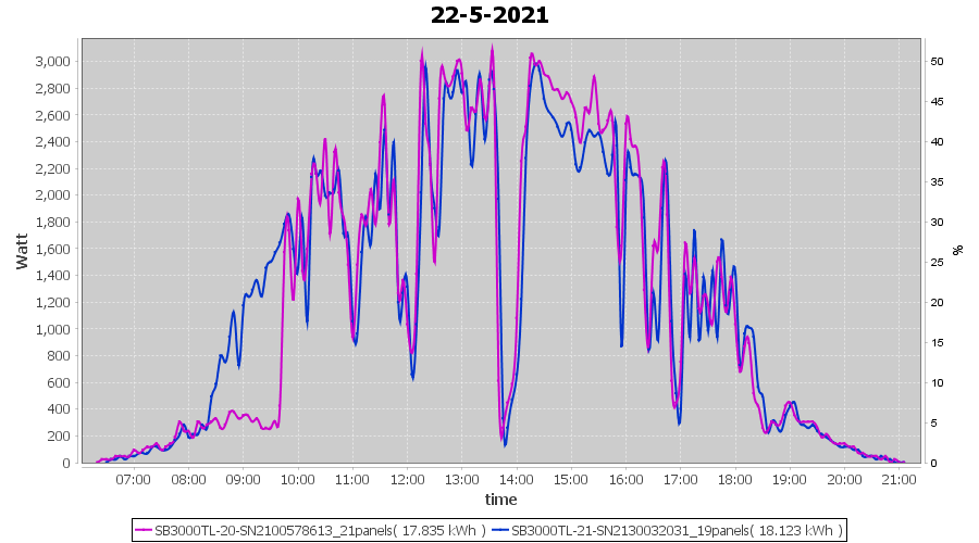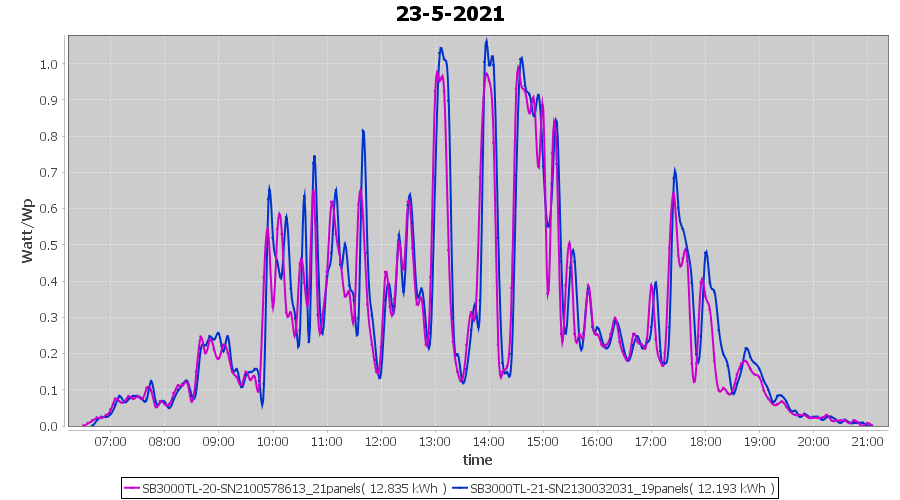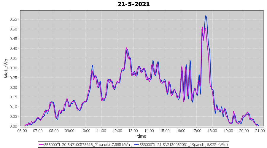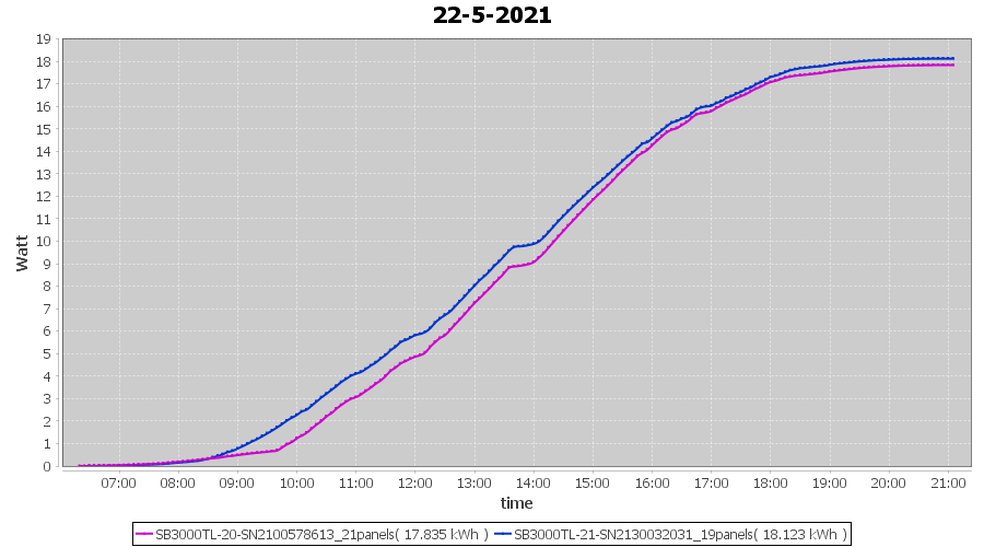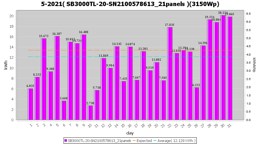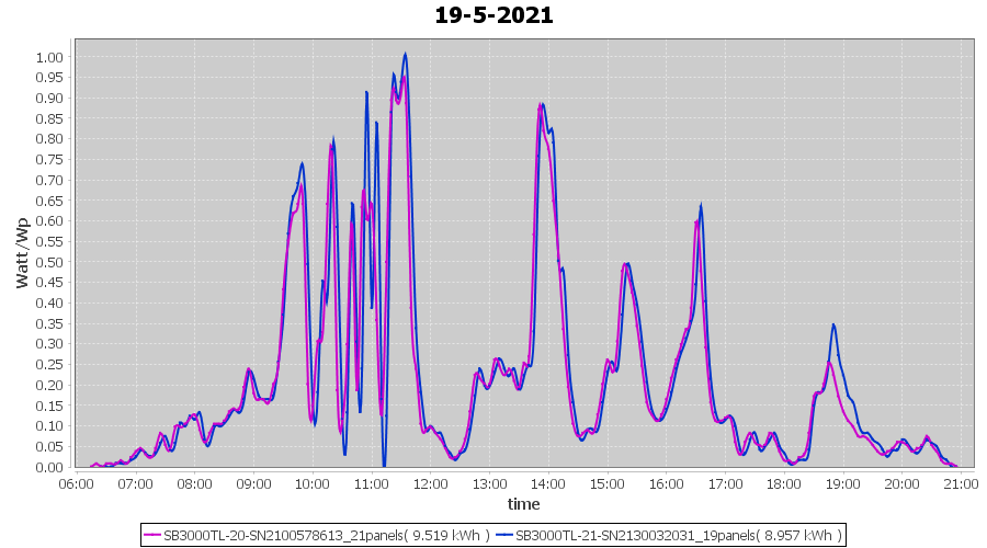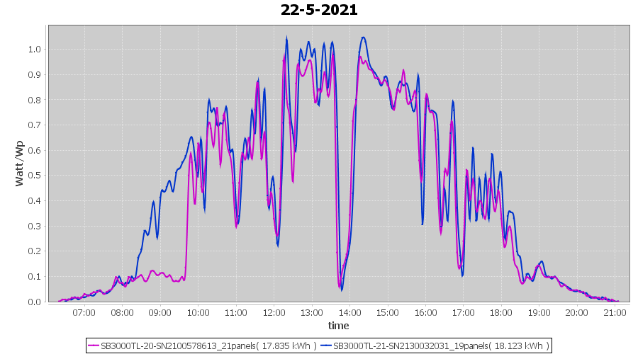 | 22-5-2021 | kWh | Sum | W/Wp | 35.958 | 6000 | 6.0 | 16.631 | € 12.93 | 4.9 |