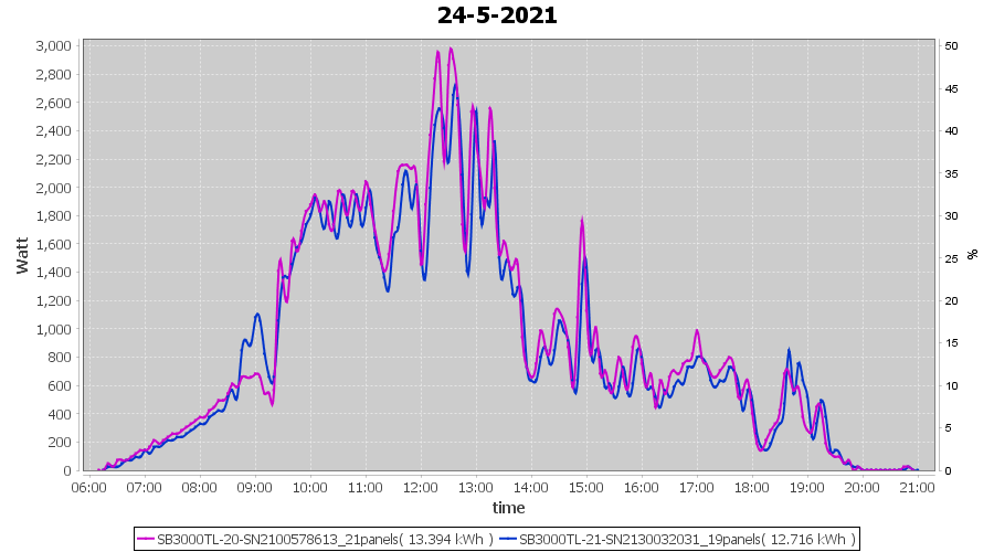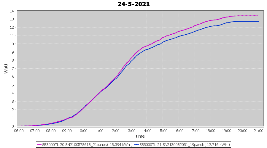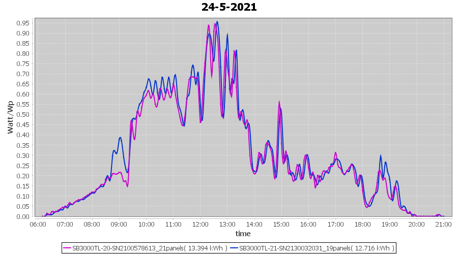 | 24-5-2021 | kWh | Sum | W/Wp | 26.110 | 6000 | 4.4 | 12.076 | € 9.39 | 3.6 |