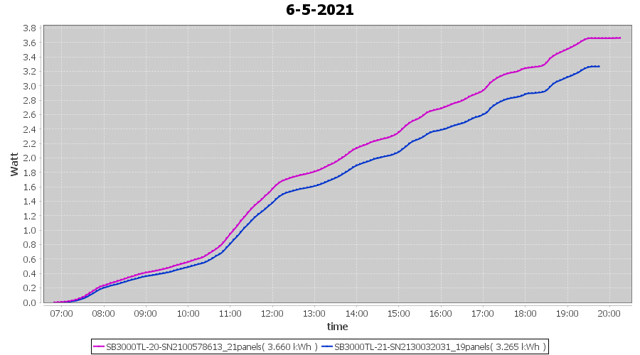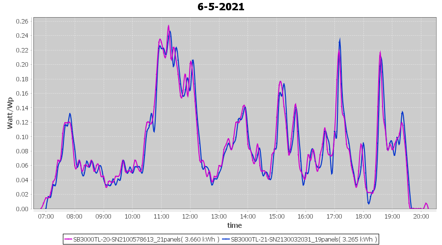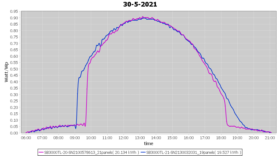 | 30-5-2021 | kWh | Sum | W/Wp | 39.661 | 6000 | 6.6 | 18.343 | € 14.26 | 5.4 |