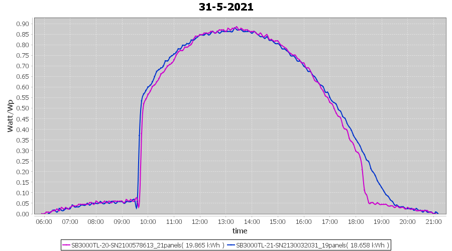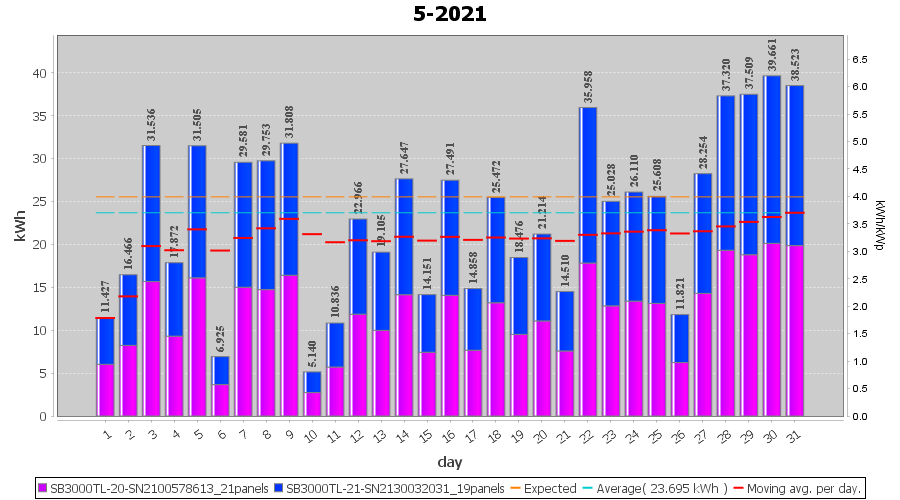 | 31-5-2021 | kWh | Sum | W/Wp | 38.523 | 6000 | 6.4 | 17.817 | € 13.85 | 5.2 |