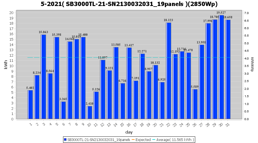 | 19-5-2021 | kWh | Sum | W/Wp | 18.476 | 6000 | 3.1 | 8.545 | € 6.64 | 2.5 |