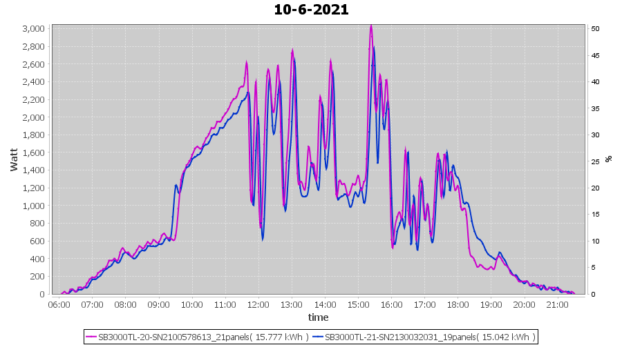 | 10-6-2021 | kWh | Sum | W/Wp | 30.819 | 6000 | 5.1 | 14.254 | € 11.08 | 4.0 |