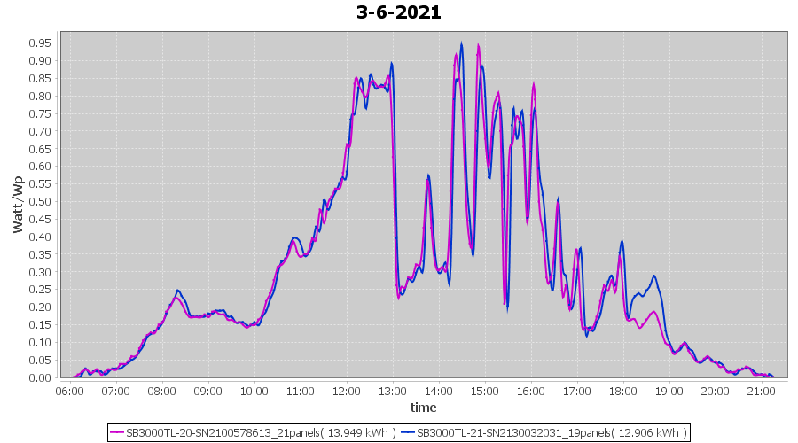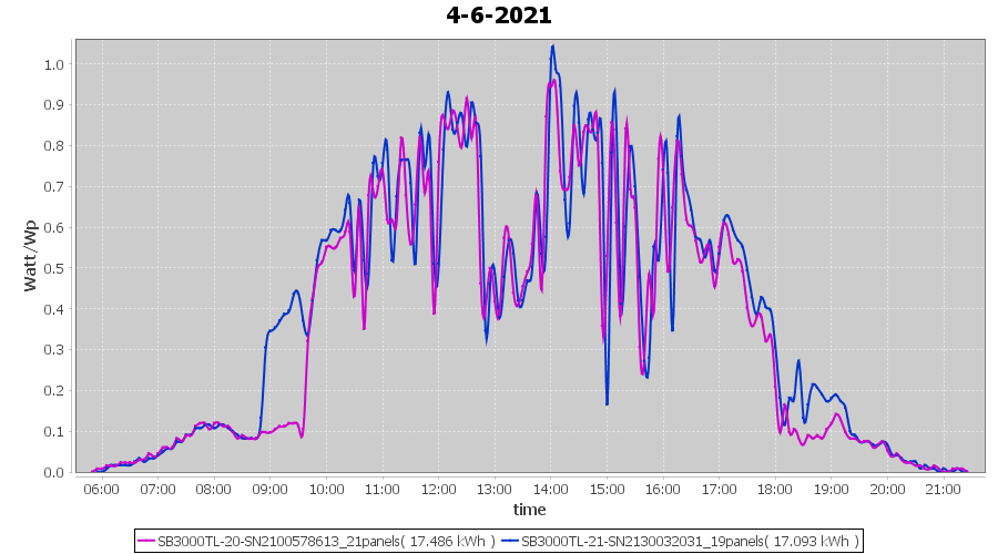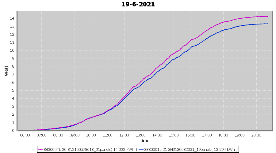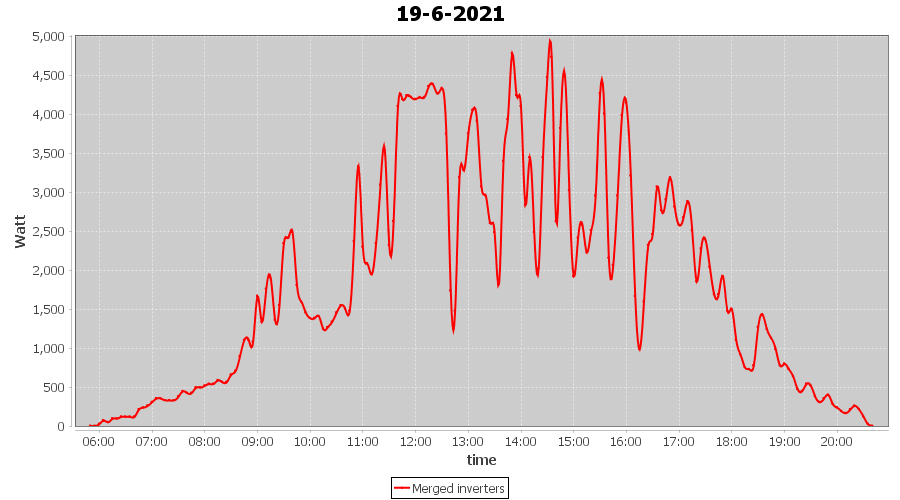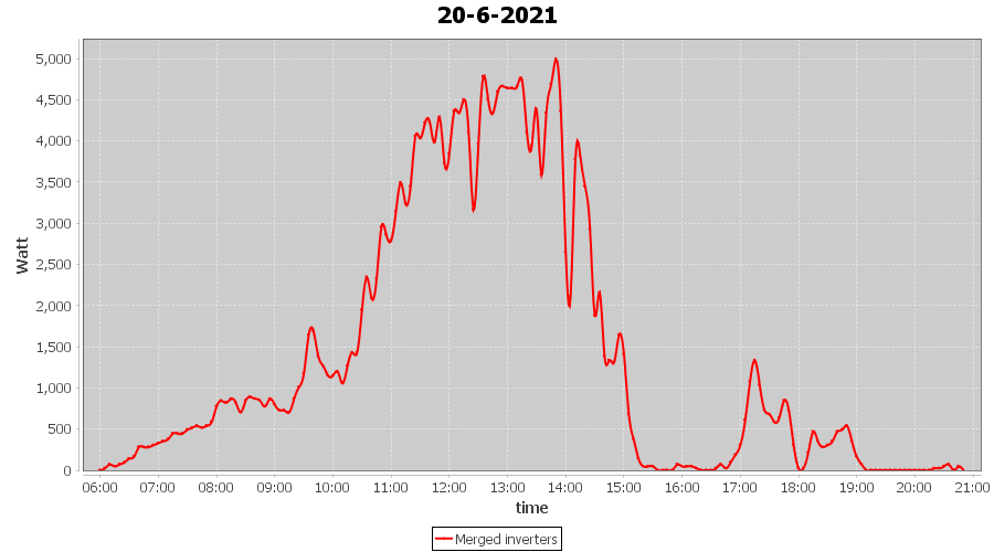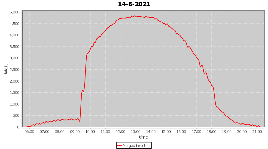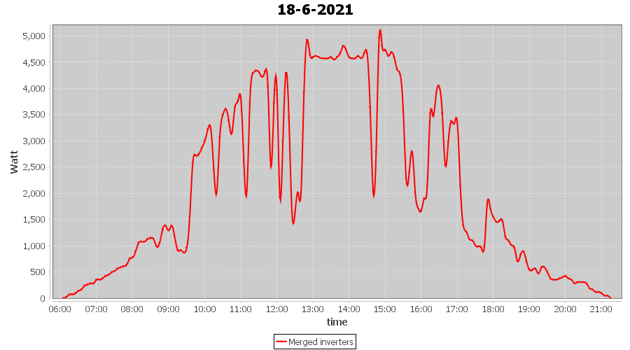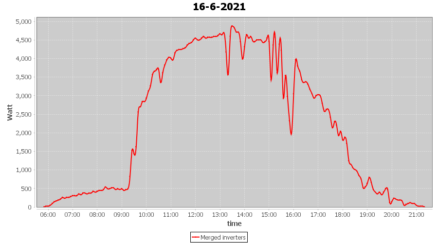 | 14-6-2021 | kWh | Sum | W/Wp | 36.148 | 6000 | 6.0 | 16.718 | € 13.00 | 4.7 |