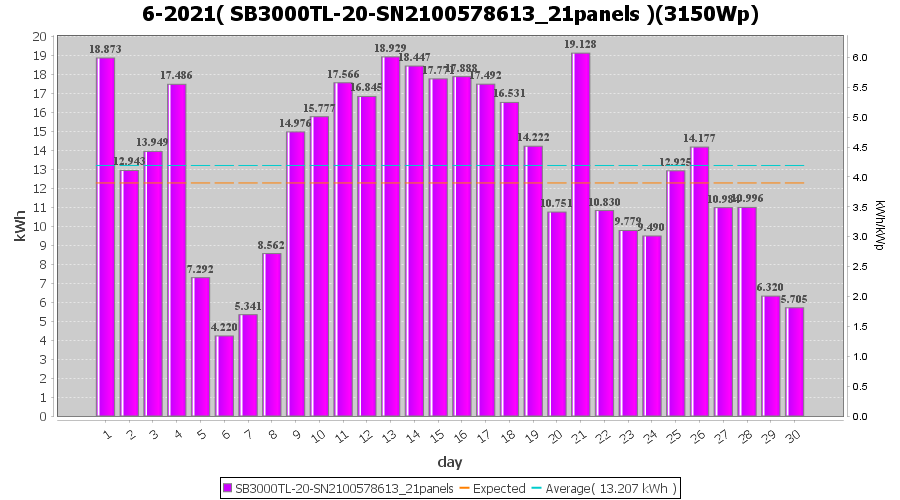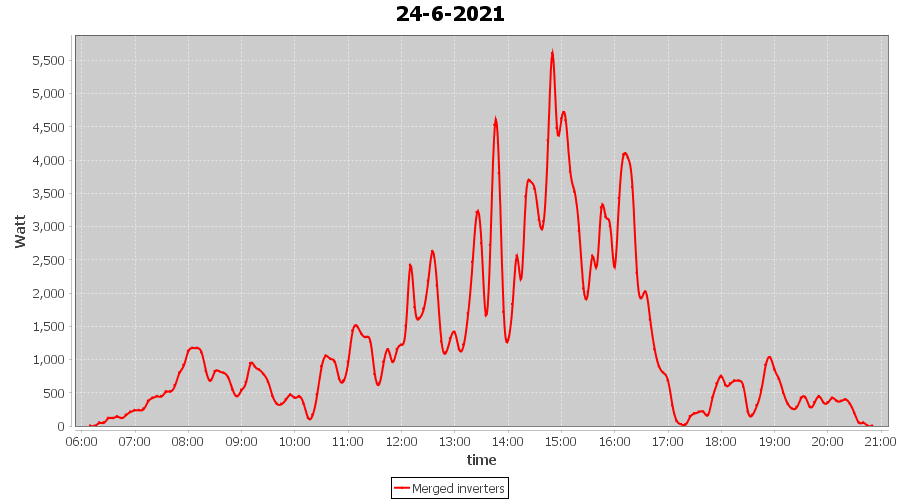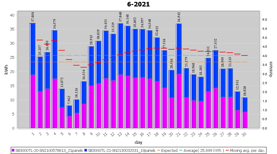 | 21-6-2021 | kWh | Sum | W/Wp | 36.942 | 6000 | 6.2 | 17.086 | € 13.28 | 4.8 |