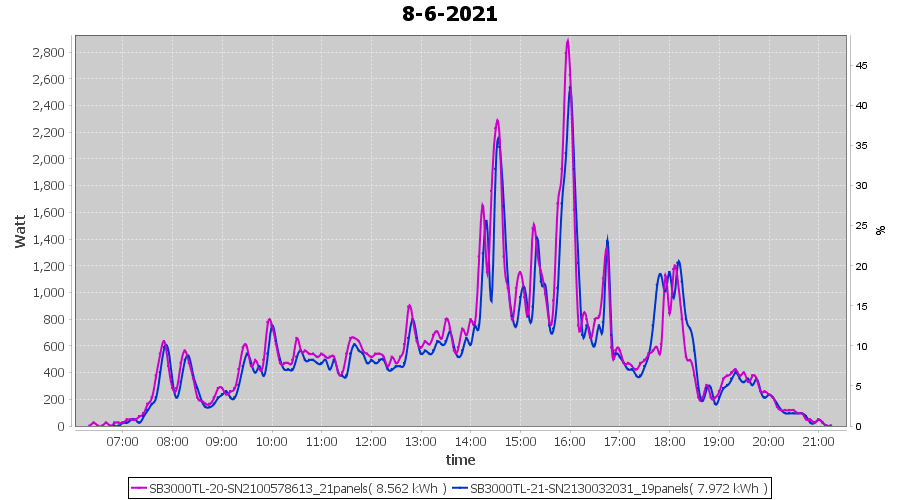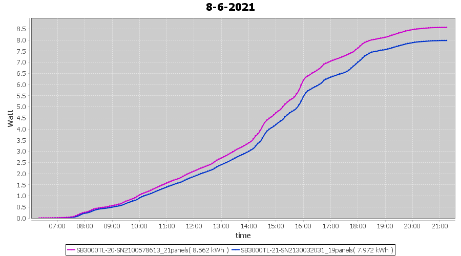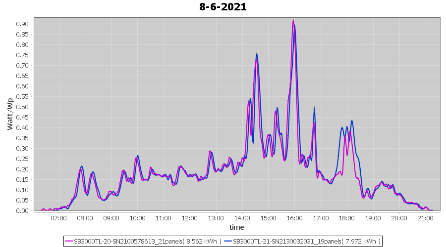 | 8-6-2021 | kWh | Sum | W/Wp | 16.534 | 6000 | 2.8 | 7.647 | € 5.94 | 2.1 |