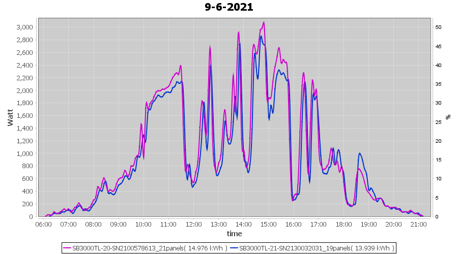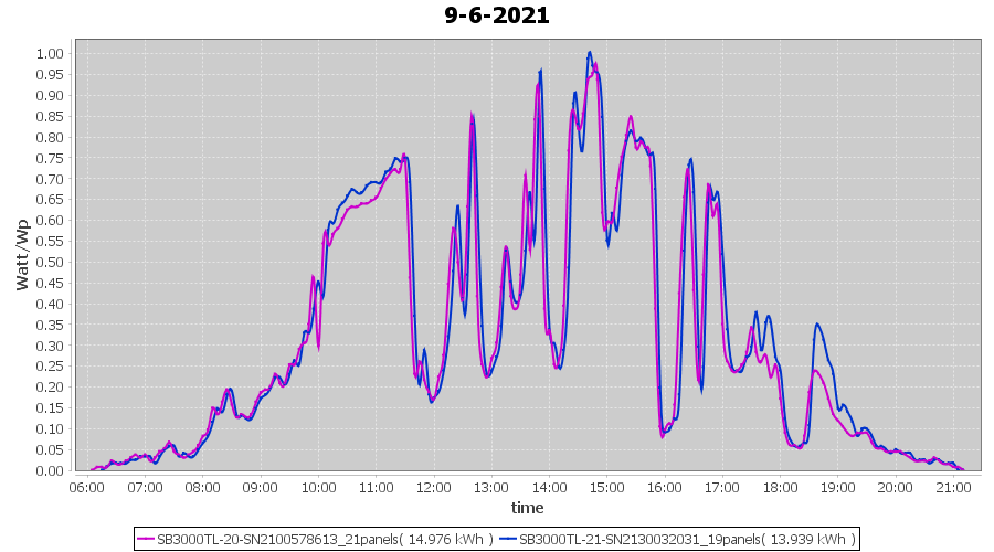 | 9-6-2021 | kWh | Sum | W/Wp | 28.915 | 6000 | 4.8 | 13.373 | € 10.40 | 3.8 |